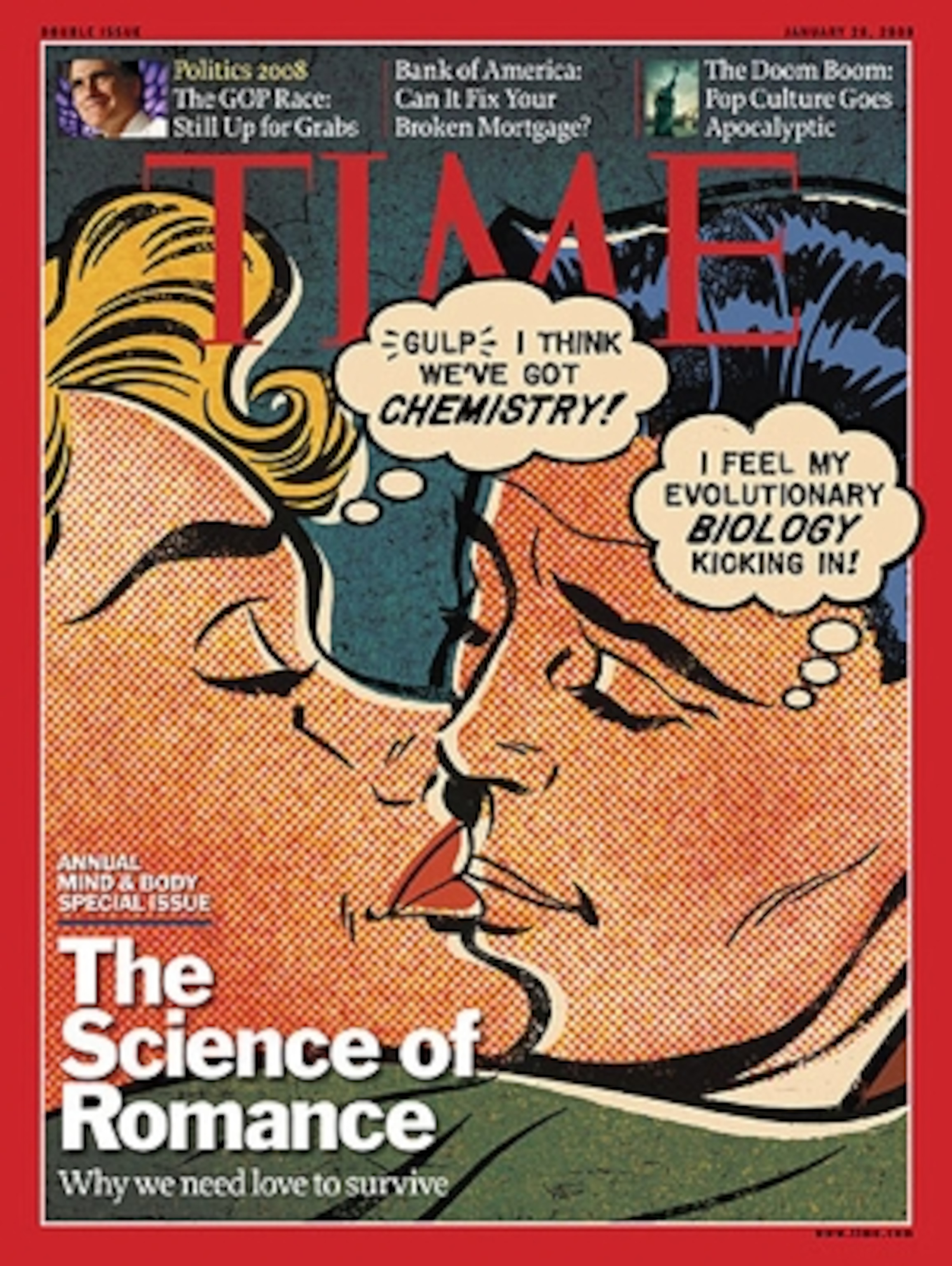 3. Romance: The Commitment Device. The January 28 issue of Time includes a series of articles on the science of romance. In my first piece for the magazine, I look at the evolution of romance, exploring the work of scientists ranging from Darwin to today’s psychologists like Martie Haselton at UCLA. I guess that means I’m the guy on the right on the cover.