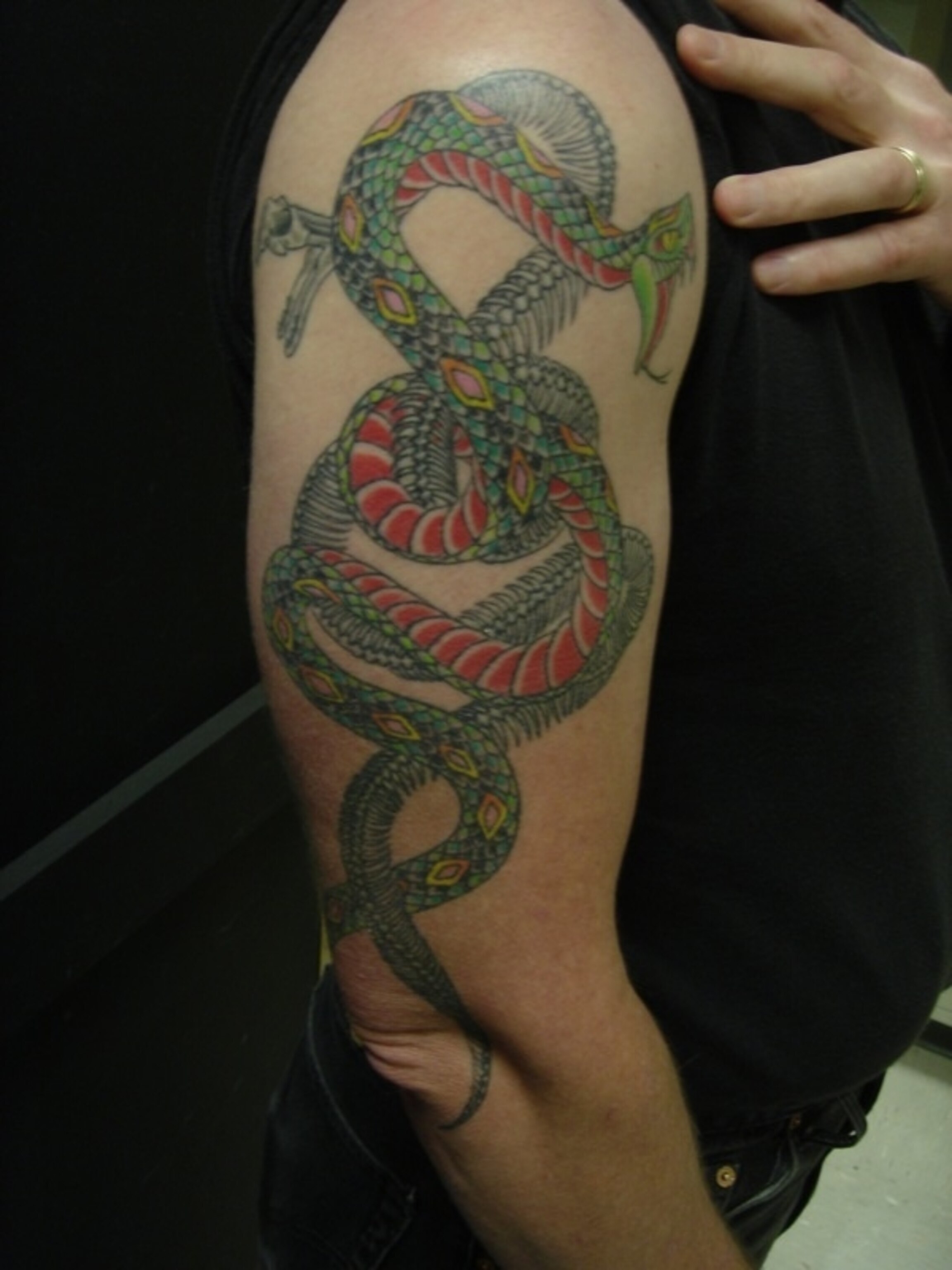 “There is no rational explanation for this tattoo, only post-inking scenarios. I do not study snakes, nor do I particularly like them. There is, however, a when. The idea and the product came at the end of a yearlong effort to delineate the biology behind a fossil skeleton. Although I have always sought to explain hard tissue morphology by reference to soft tissues, this work took me way beyond the limits of my previous understanding. The result was a massive expansion of my thinking on how modern biology can be integrated into understanding fossil populations. In the post-publication stupor, the snakes appeared and got inked. I suppose you could say that they represent the commingling of knowledge from living forms with that from fossil forms. But then again you could suggest any number of ‘rational’ explanations for having two large snakes permanently inked on your arm.”– Gary Richards, UC Berkeley