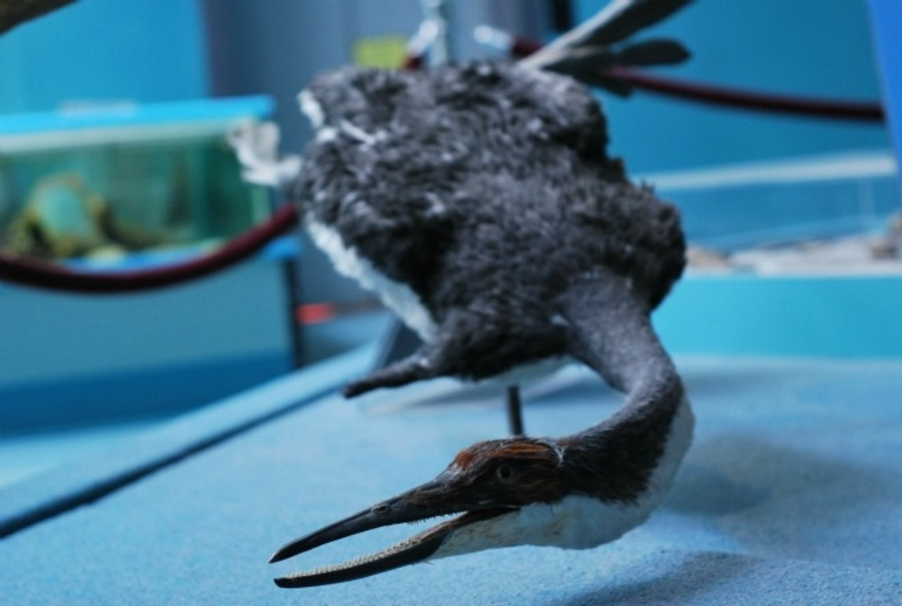 The Cretaceous toothed bird Hesperornis. This is one of the few life restorations of the bird I've seen in my museum journeys. Photo by the author at the NMMNHS.