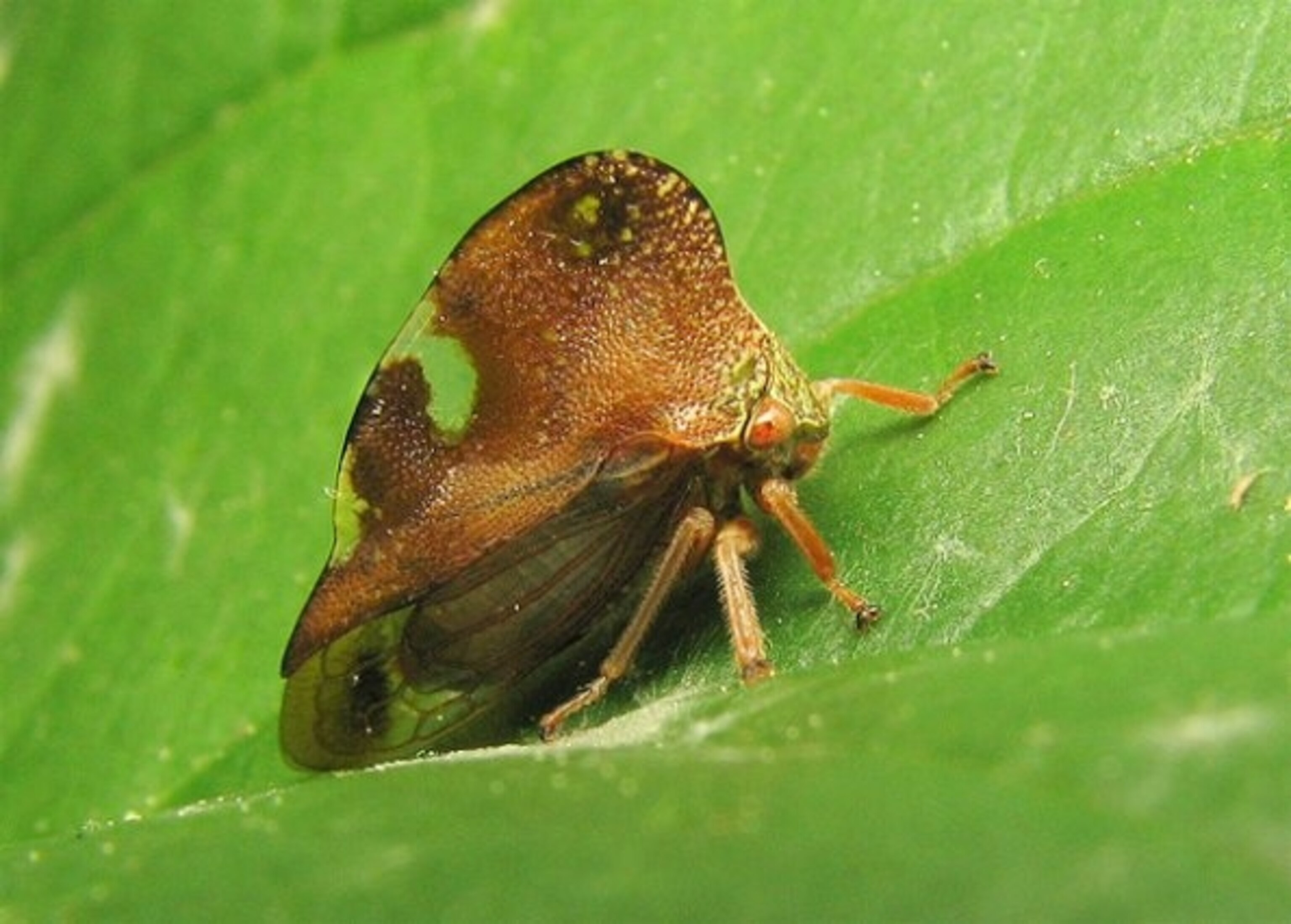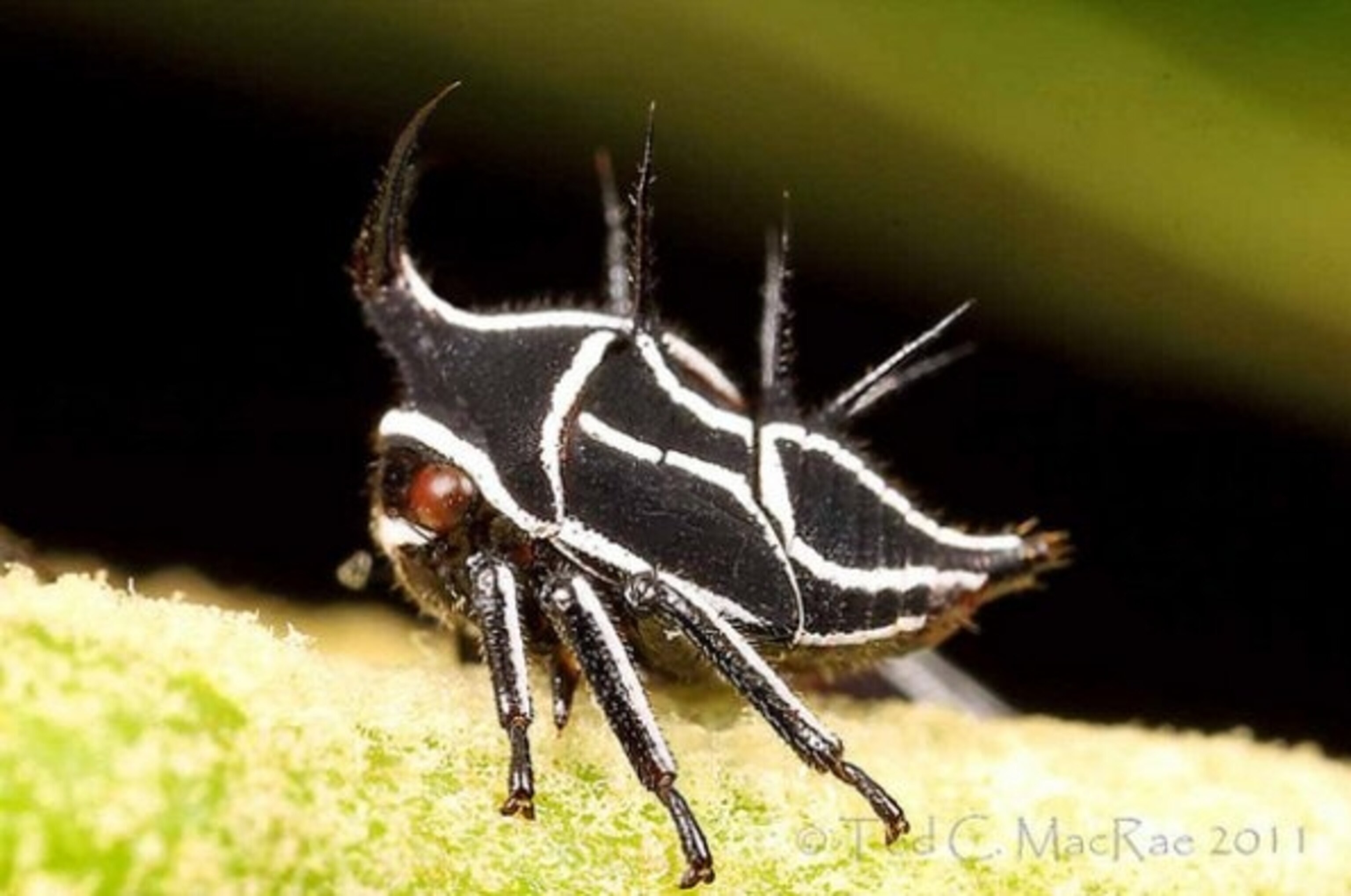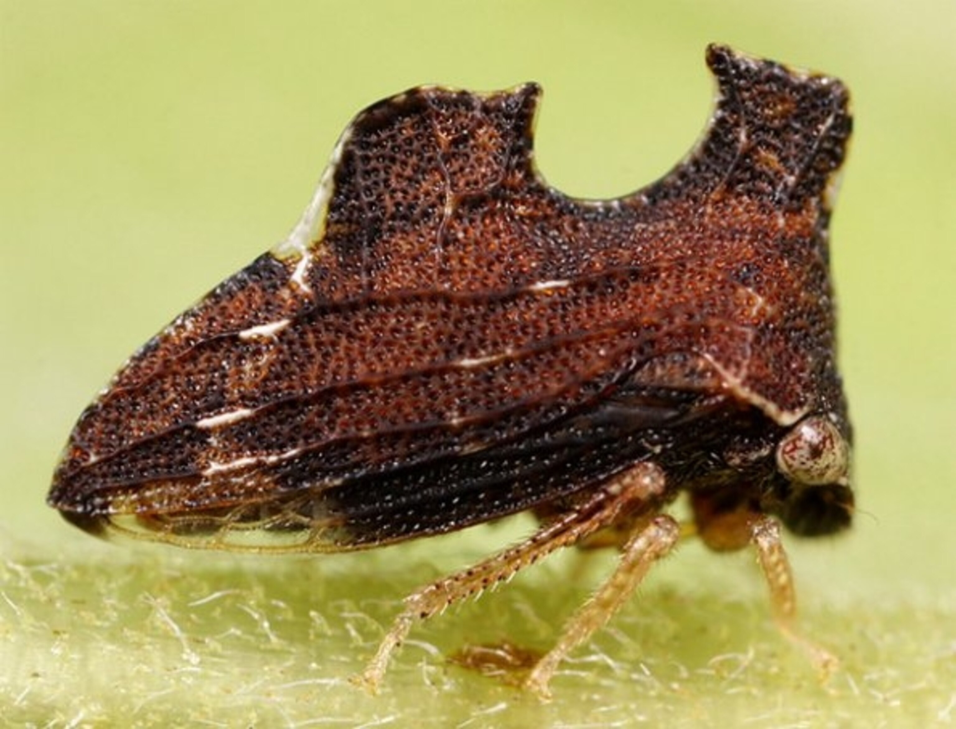 Treehoppers are insects that look like they have materialised from the imagination of a drunk fantasy artist. They would look like simple cicadas, were it not for the elaborate structures on their backs, known as “helmets”. These take the form of thorns, leaves, droppings, ants, and other shapes too bizarre to describe. They are the signature feature of the treehoppers. All 3,200 or so species have them.