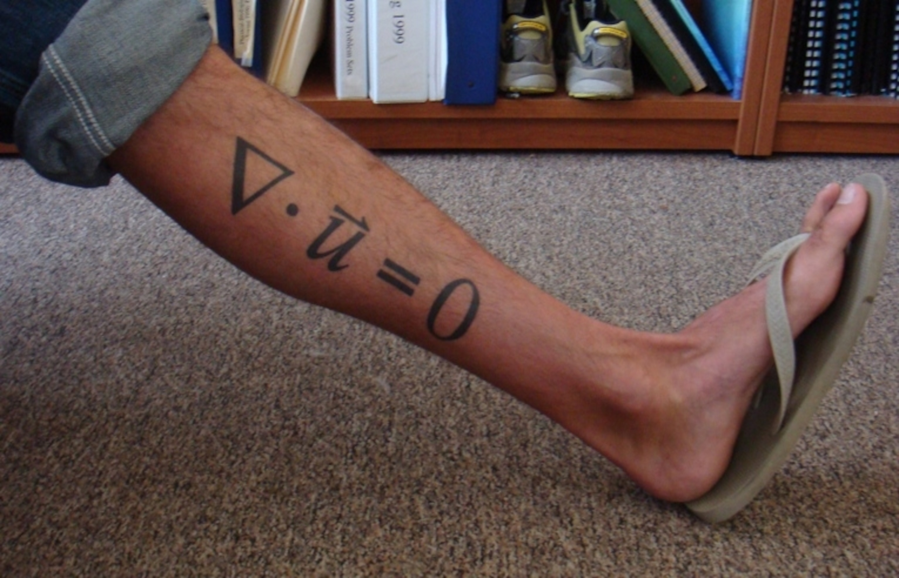“This, on my leg, is the incompressible form of the conservation of mass equation in a fluid, also known as the continuity equation. When people ask what it means, I say it defines flow. Sometimes I say it means you should have studied more physics, but that is only when I am feeling like being funny. What it means in more detail is that, for an incompressible fluid, the partial derivative of the velocity of the fluid in the three spatial dimensions must sum to zero. It therefore concisely states the fundamental nature of a fluid.”My advisor took this picture, and I swear he is obsessed (in a good way) with this tattoo. He is giving a talk at Woods Hole next week as he is the recipient of an award, and he is planning to show off ‘how quantitative scripps students are’ which i think is hilarious and only slightly mortifying. Speaking of mortifying, it is slightly mortifying to be sending this email at all–I have to admit I am a little embarrassed. It is definitely the most vain thing i have done today. I do have an ulterior motive which I have no problem admitting: I want to stake a claim on this particular piece. I guess it might be a little lame to want to claim ownership over something so silly but there it is and I guess at least I can admit it.”