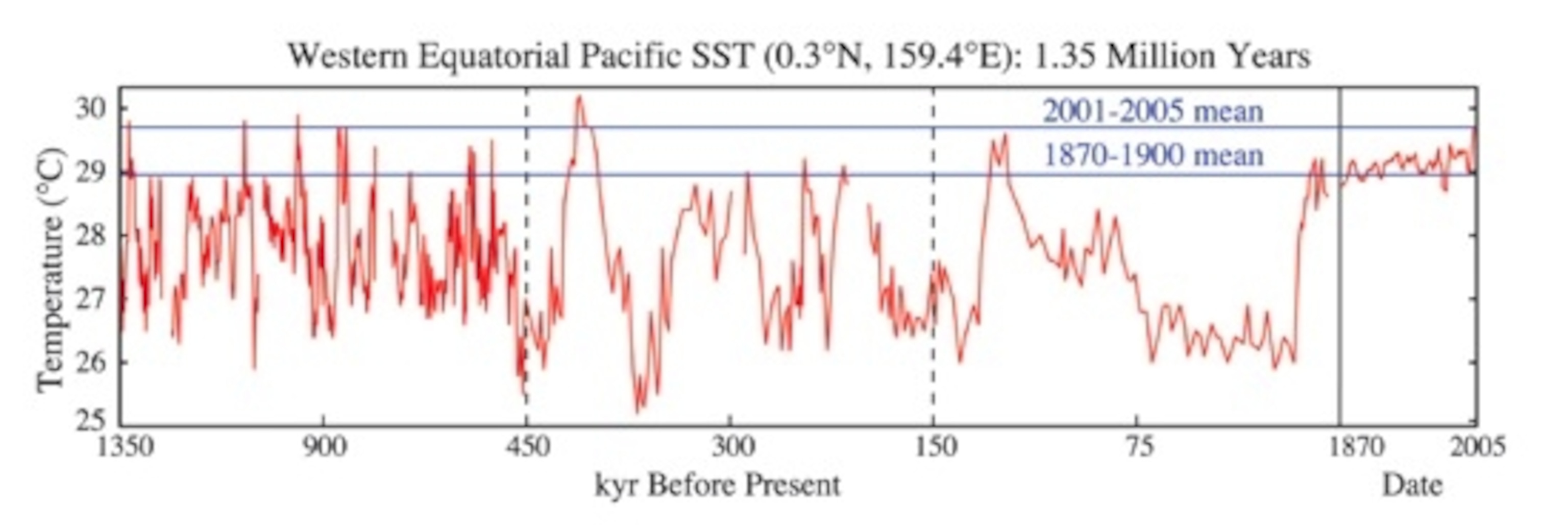 I always like to consider questions of the day from the perspective of deep time. How hot is it these days? Look back 1.35 million years, and you can see it’s pretty hot. Here’s a chart, published yesterday in the Proceedings of the National Academy of Sciences (free paper here). It combines historical records with geological evidence from the West Pacific to reach back 1.35 million years (kyr= thousands of years ago). The scale is telescoped near the right end, since recent warming has been so fast that it would be hard to make out its details otherwise. Two lines mark some average recent temperatures–the lower line is from 1870 to 1900, when recent global warming was just starting to kick in. The top line is from 2001 to 2005. As the record shows, the temperature has seesawed a lot over time, mainly due to the swing in and out of Ice Ages. The last time the Earth was this hot was about 400,000 years ago, and it will take a couple degree more to put us above anything that the planet has experienced in the past 1.35 million years. As the authors of the new study point out, projections based on “business-as-usual” rates of carbon dioxide emissions indicate that the planet will warm at least 2-3 degrees celsius by 2100. In other words, off the chart.