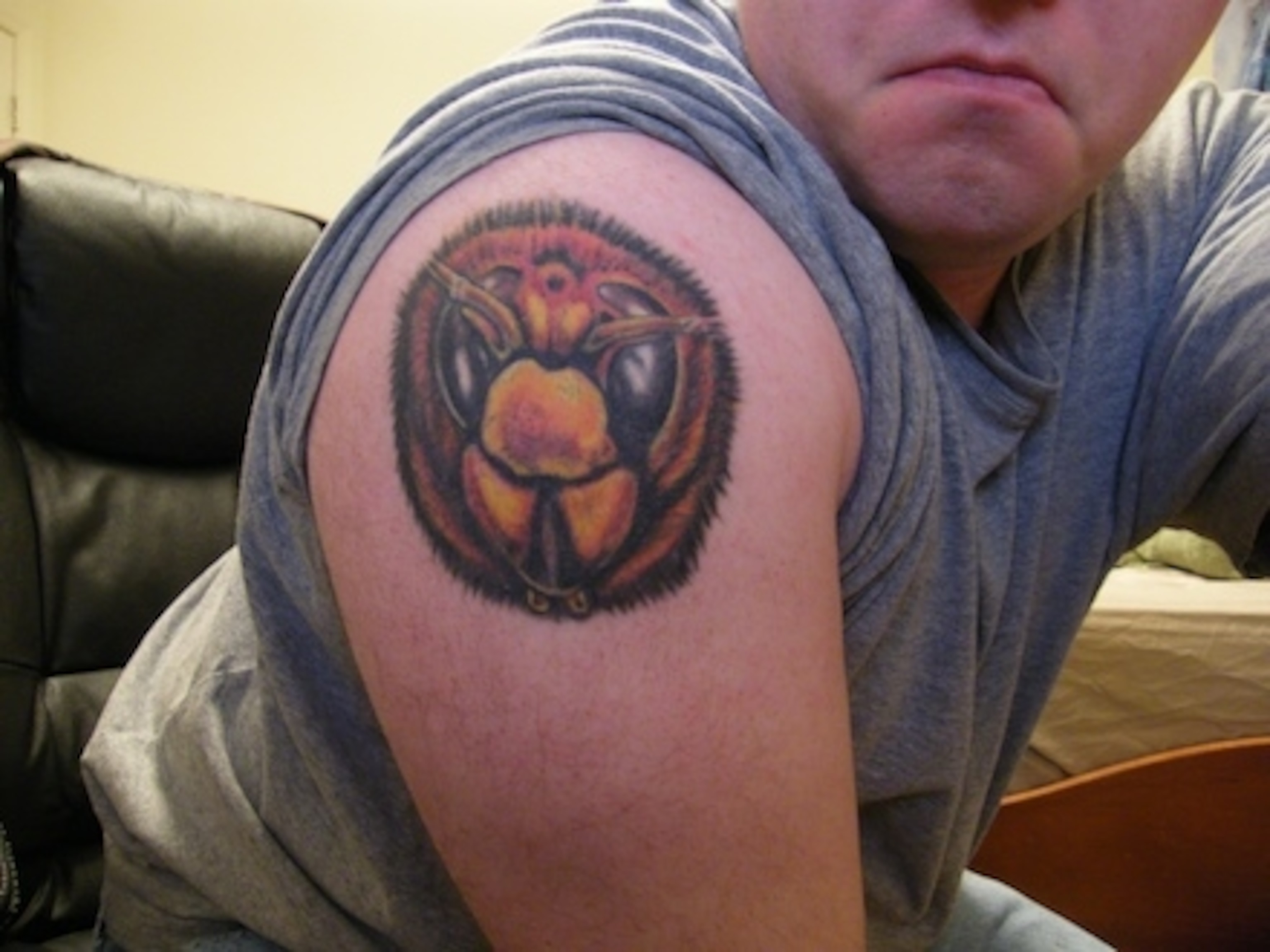 Nick writes, “A tattoo of Vespa crabro. I got it while I was working in the entomology department of Va Tech. I was the most hardcore nerd there.”