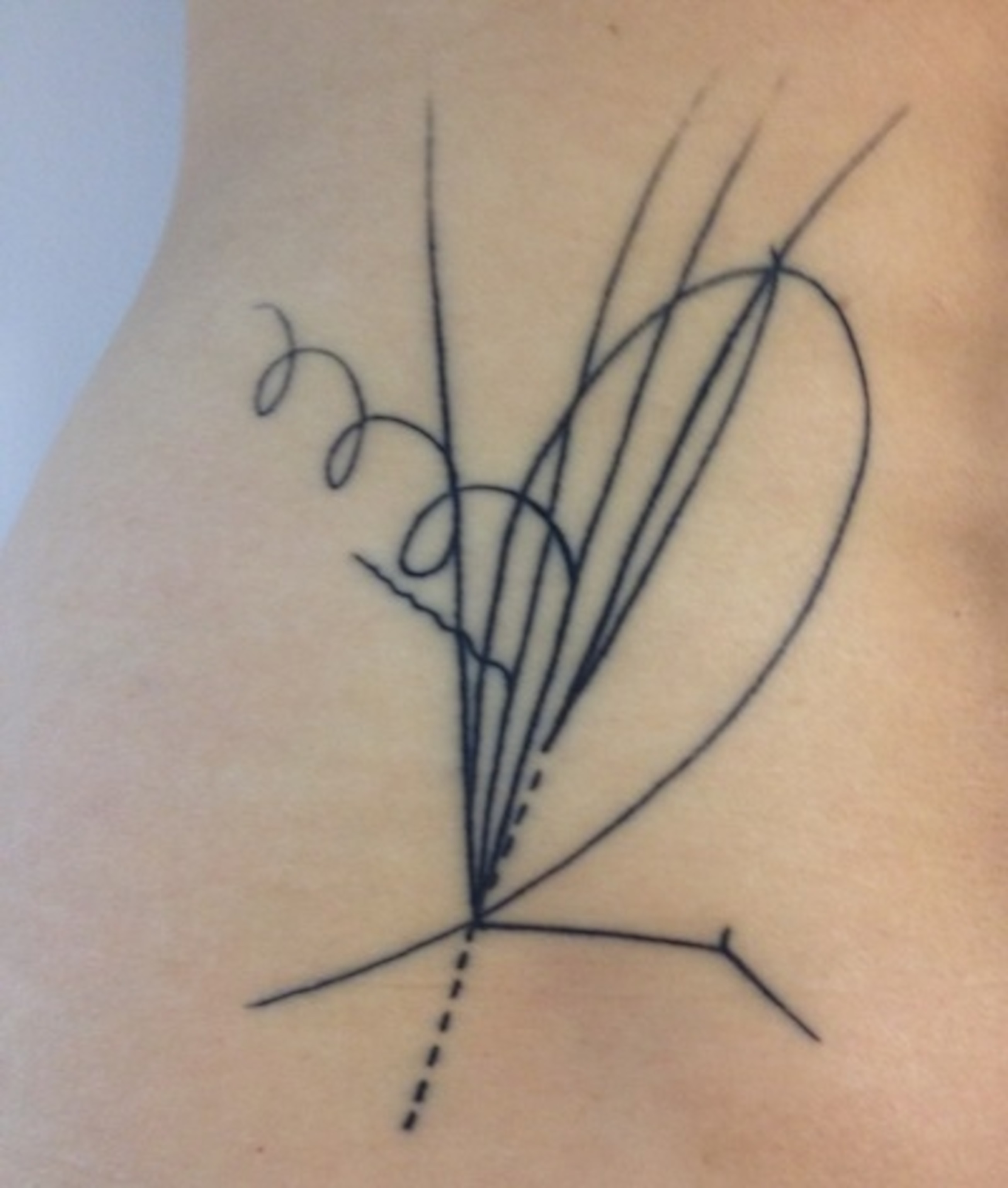 Xue Sun writes, “I’ve attached a photo of some relatively recent ink I got on my waist, done by Nalla at Goose in Brooklyn, NY. It’s a diagram of the bubble chamber event that led to the discovery of the charmed baryon. While I’m actually a neuroscientist and not a physicist, it was learning about quarks in high school that gave me my first ‘Wow! Science!’ moment. When I found this image, I immediately knew I had to have it as a tattoo.”