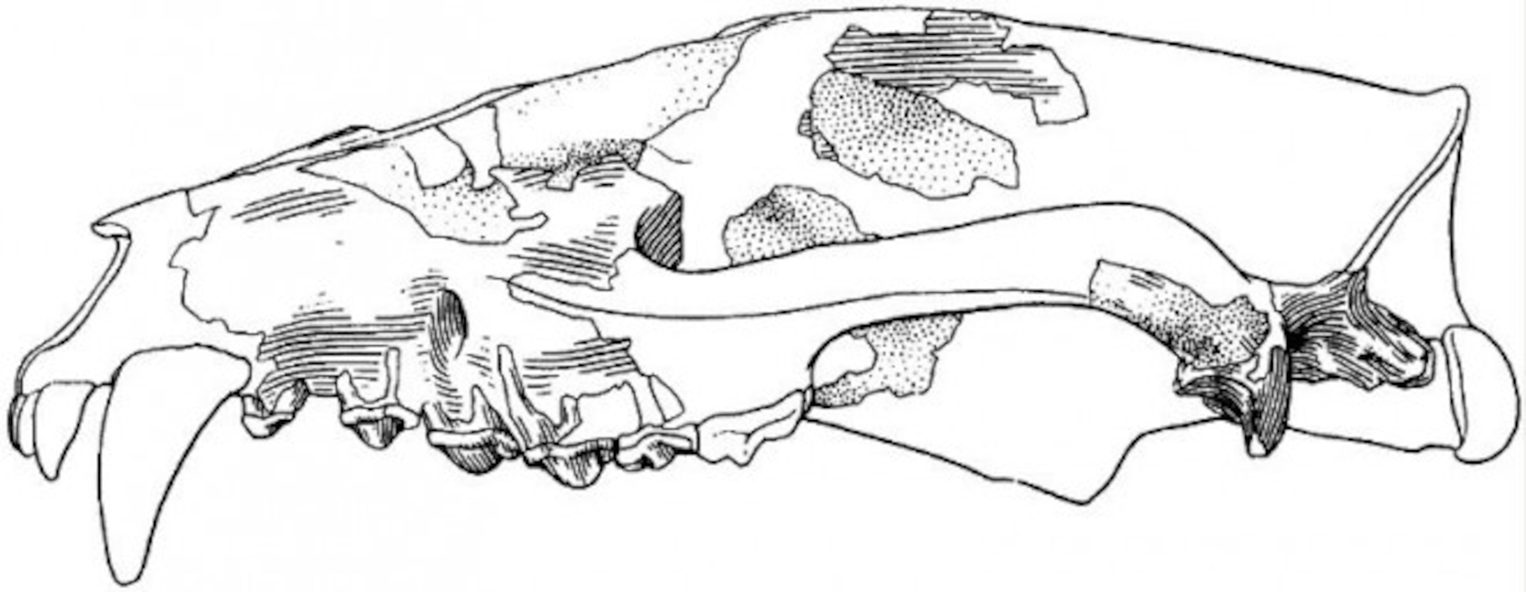 Image: A drawing of the restored skull of Dissopsalis carnifex, a creodont from the Miocene of Kenya. From Wikipedia.