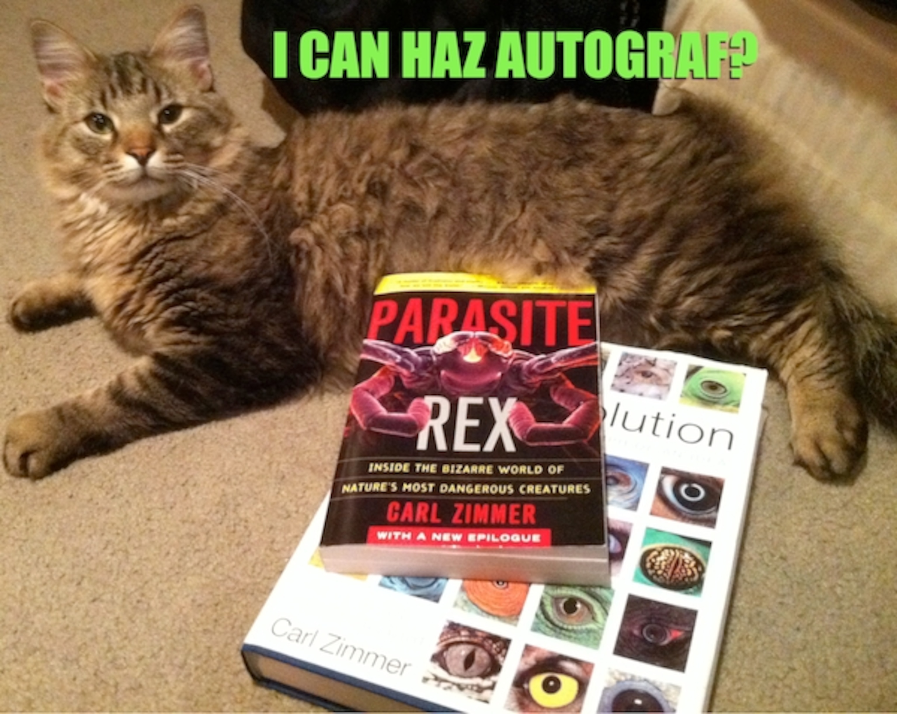 Thanks to Joe DeCapo for his response to my offer of an autographed book plate for the new edition of Parasite Rex. And yes, his cat (named μ) does probably haz one.