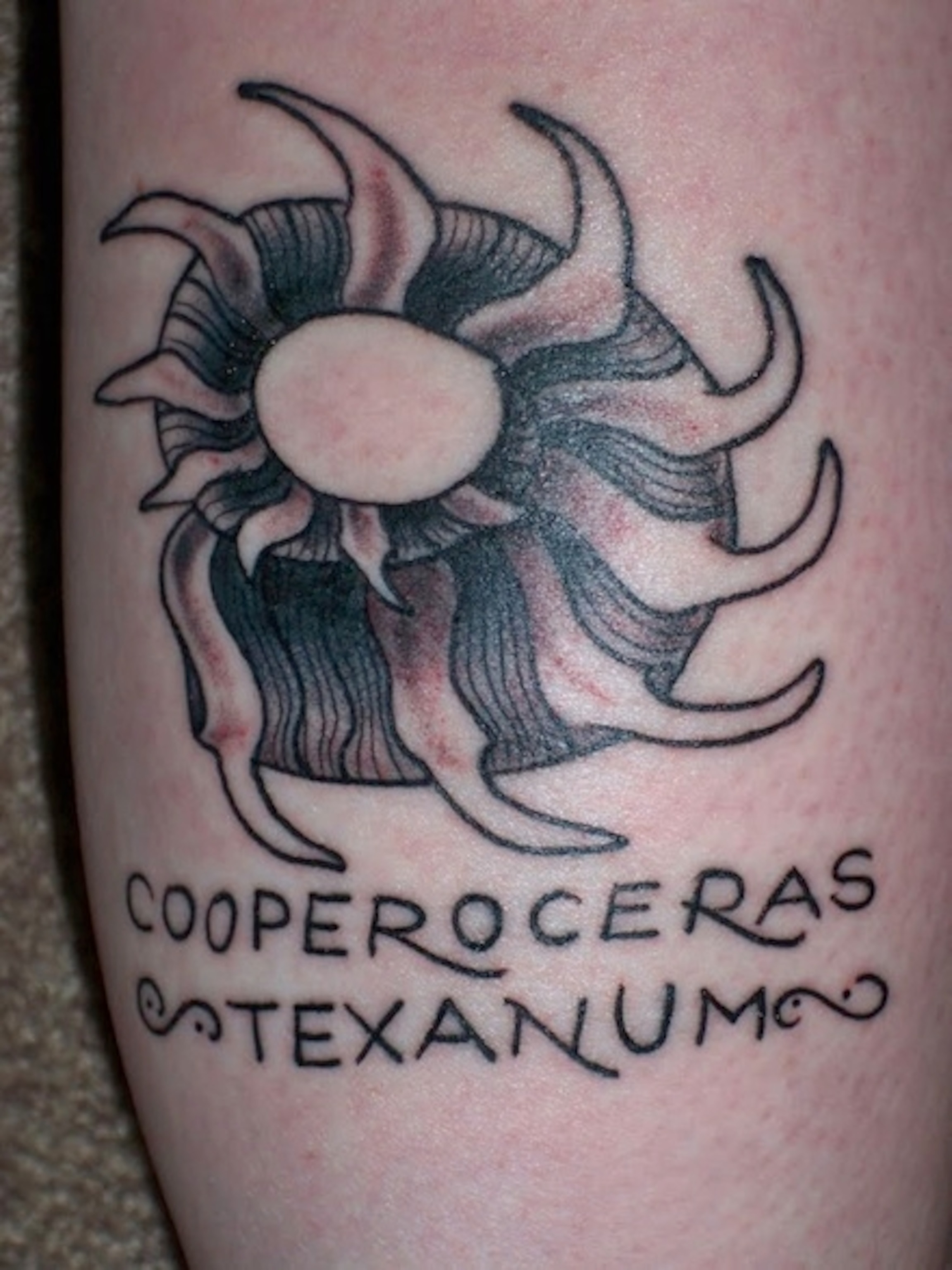 I got my tattoo in 2008 after raising enough money by carrying around a jar marked “tattoo fund” as I bar hopped for my 21st birthday. The tattoo is of a Permian cephalopod from the Guadalupe Mountains of Texas, Cooperoceras texanum.