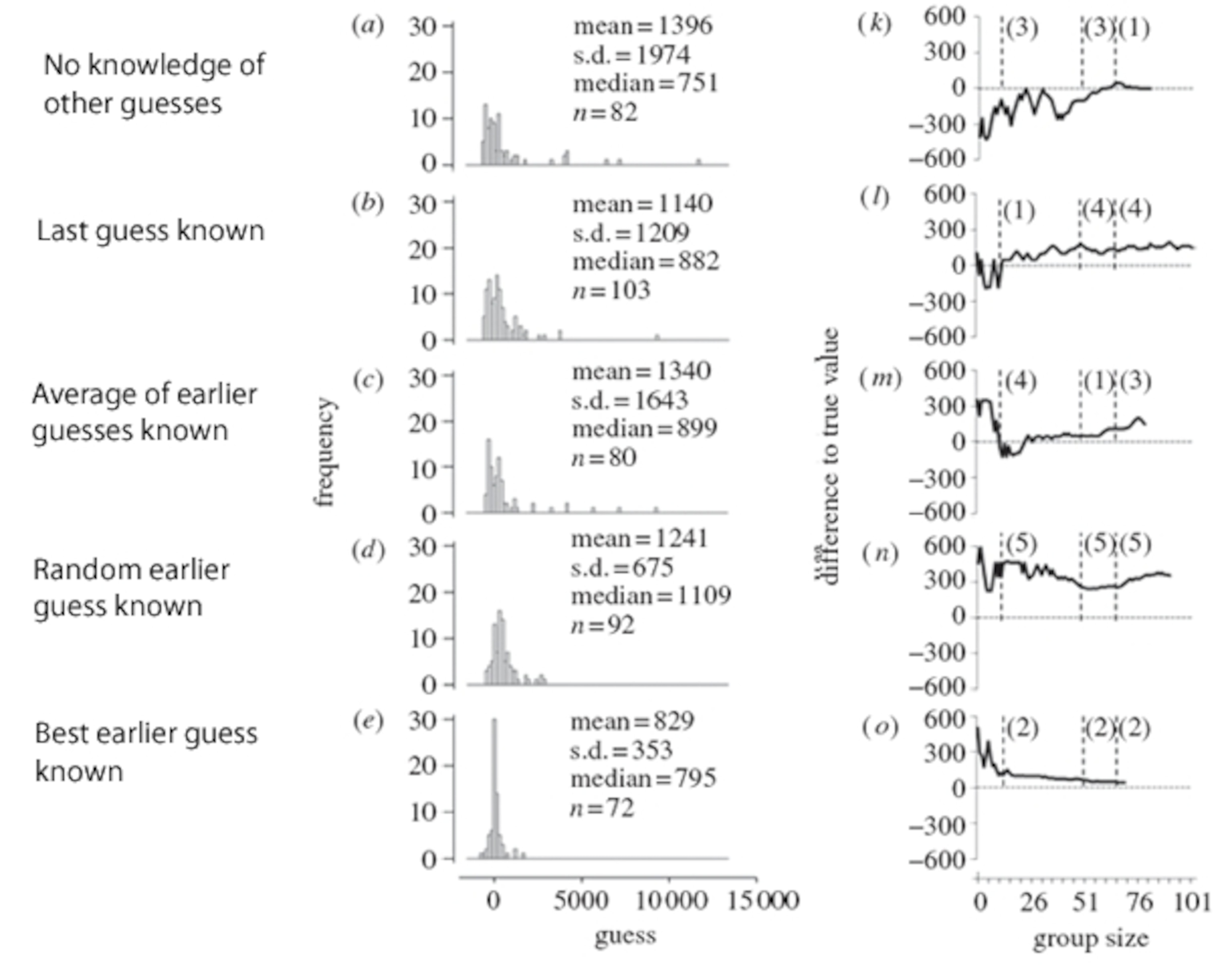 Andrew King from the Royal Veterinary College found that it falls apart, but only in certain circumstances. At his university open day, he asked 82 people to guess the number of sweets in a jar. If they made their guesses without any extra information, the wisdom of the crowd prevailed. The crowd’s median guess was 751.* The actual number of sweets was… 752.