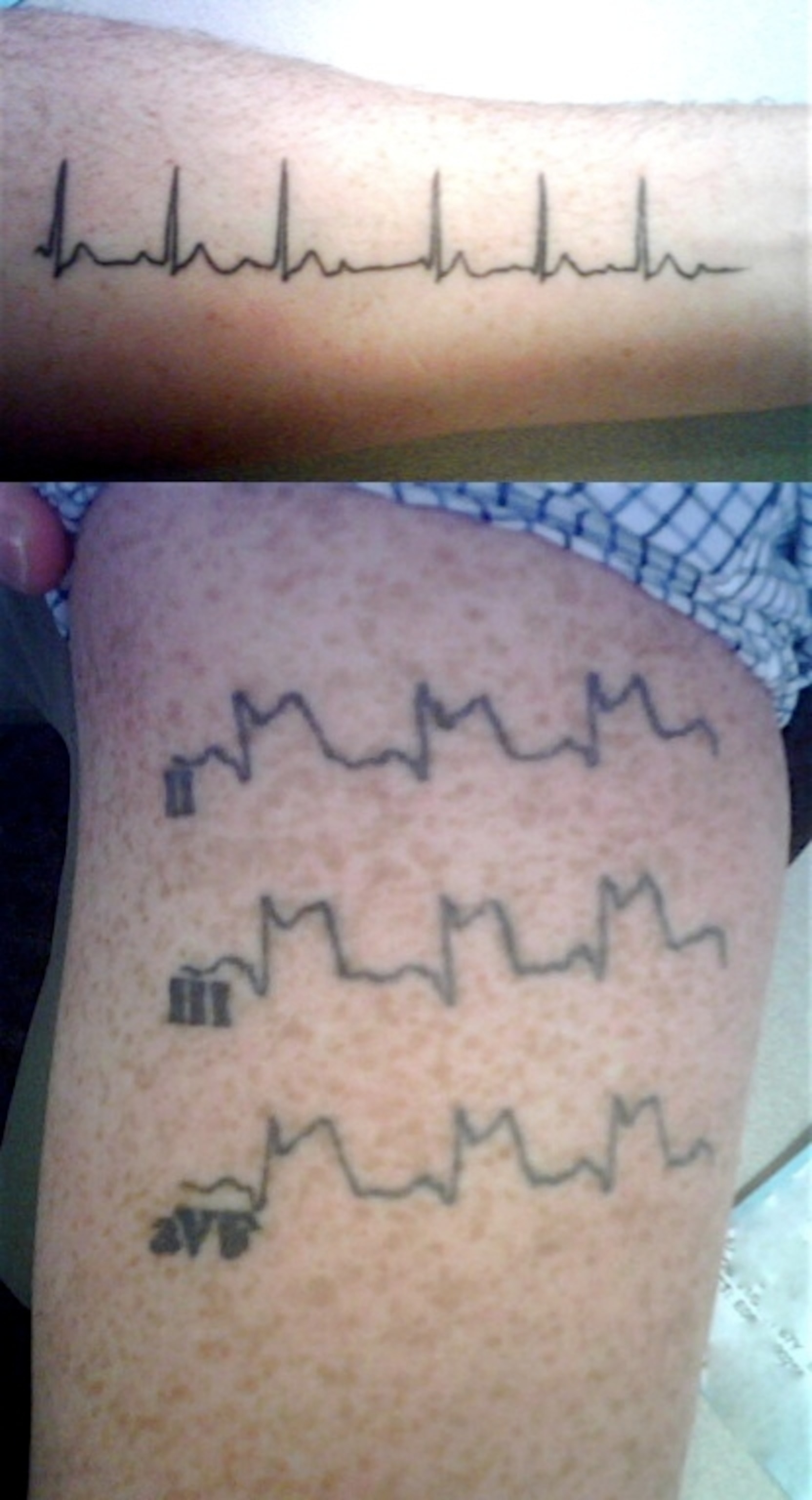 “The first is an ECG, single lead, called a rhythm strip, which shows a common and generally benign arrhythmia called second degree heart block, Mobitz Type I, also called Wenckebach. The interval between the P wave (atrial contraction) and the QRS (ventricular contraction) progressively increases till a QRS is dropped. The second is a three-lead ECG showing an acute inferior myocardial infarction, aka a heart attack.”