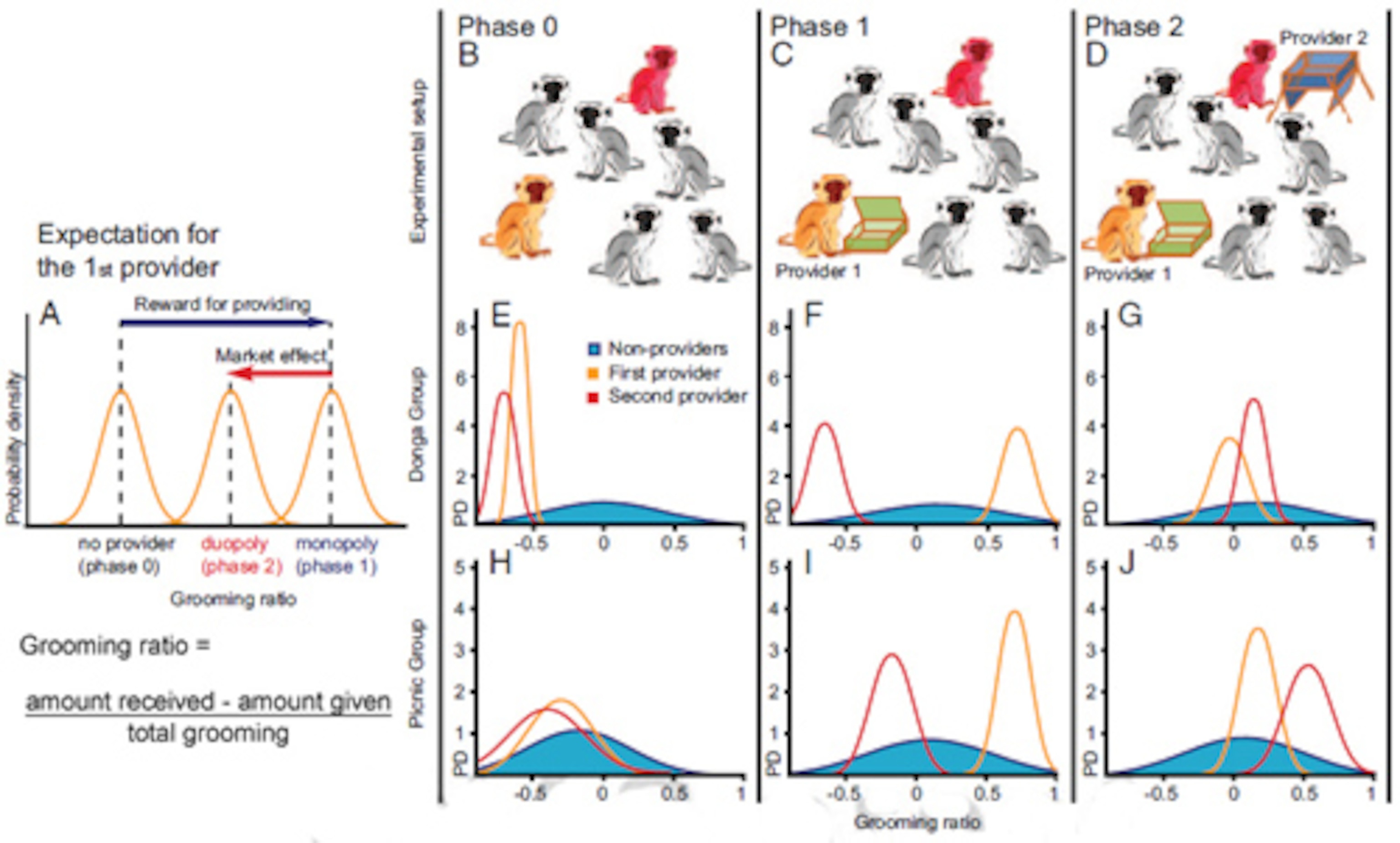 These are exactly the sorts of pattern that market theory would predict. The value of the first female’s container-opening ability fell by half when the second female was trained and the grooming she received followed suit. The second female’s stock rose, but only to half the extent that that of the first female initially did – the fact that two of them could provide a service meant that it became less valuable than when one monkey operated without competition.