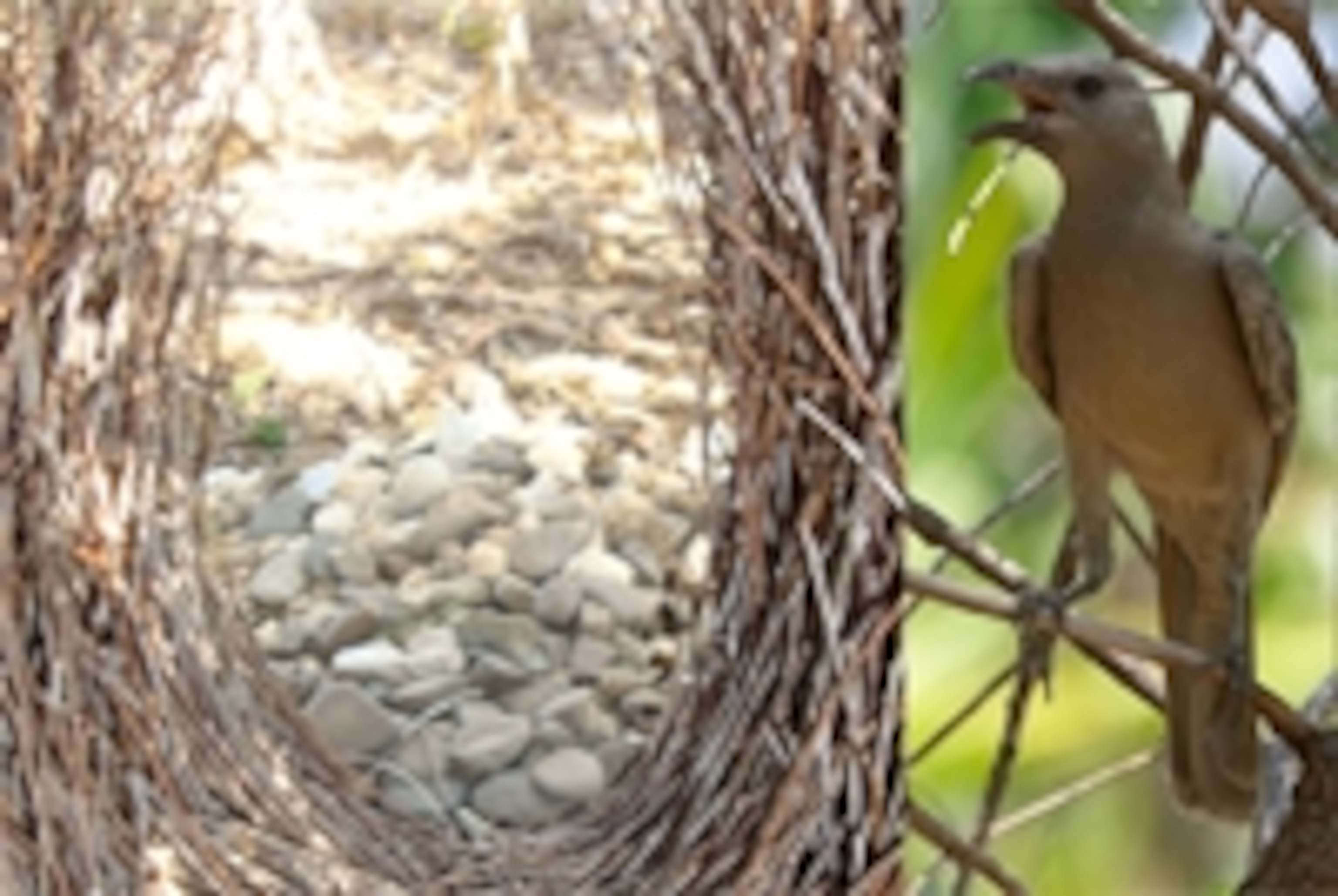 The great bowerbird is both architect and illusionist. He creates a lined avenue of twigs leading to a display area covered in stones. The stones are carefully arranged according to size, which makes the courtyard look smaller and the bird look comparably bigger to a female, watching from the avenue. These “forced perspective” illusions are found in the entrance to Disneyland, various ancient monuments and post-Renaissance Western art. And, apparently, in the nest of a bird.