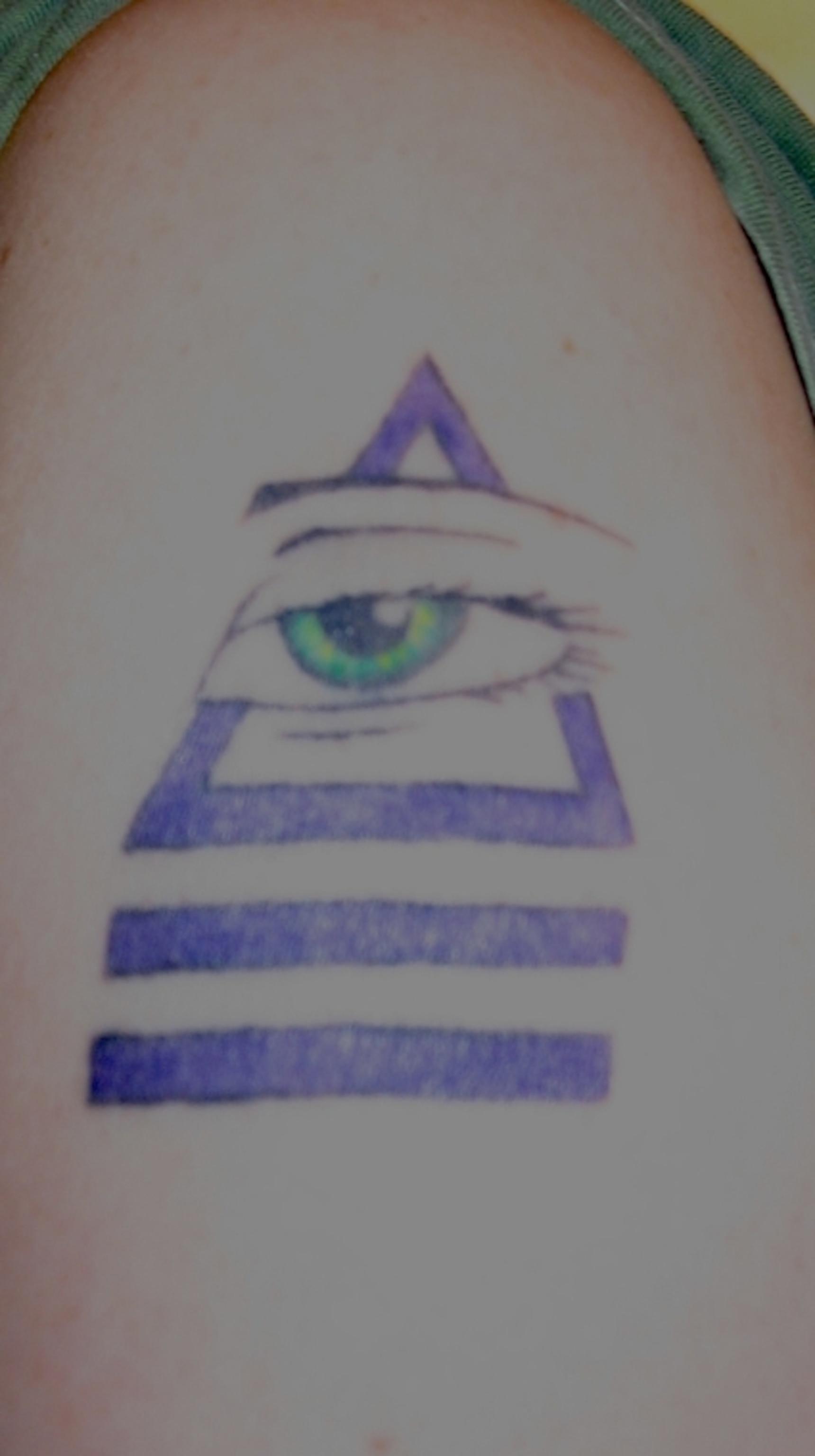 This is my math-and-philosophy tattoo. The purple bit is the math symbol for “to define”, used in proofs to set [variable on left] equal to [stuff on right]. The eye is both a rebus for “I” and a symbol for “to observe”, and it’s in front of the definition symbol to indicate that observation comes first, definition follows. Or as Sherlock Holmes put it, “It is a capital mistake to theorize in advance of the facts.” So it means “I observe and then define”, and “Data before decisions”, and “I decide for myself (based on my own observation)”, and therefore implies “Think for yourself.”