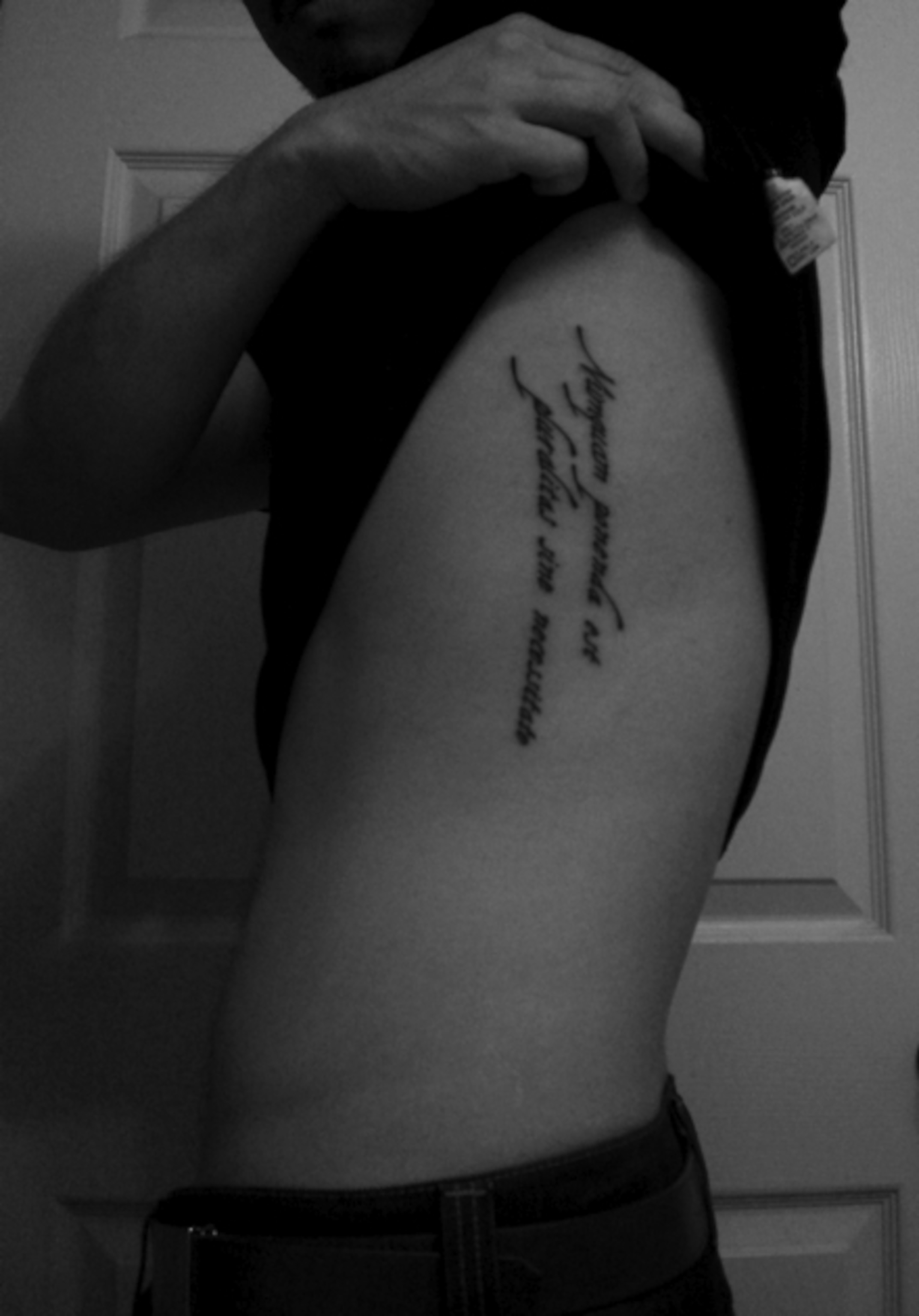 Jimmy writes, “This is a picture of my recent ink in commemoration of getting my Ph.D in Molecular Pharmacology. Occam’s Razor in its original Latin text —Numquam ponenda est pluralitas sine necessitate–roughly translated, plurality should never be posited without necessity. I’ve always subscribed to this fundamental tenet behind the scientific method not only in my passion for science, but also in my beliefs in philosophy and religion.