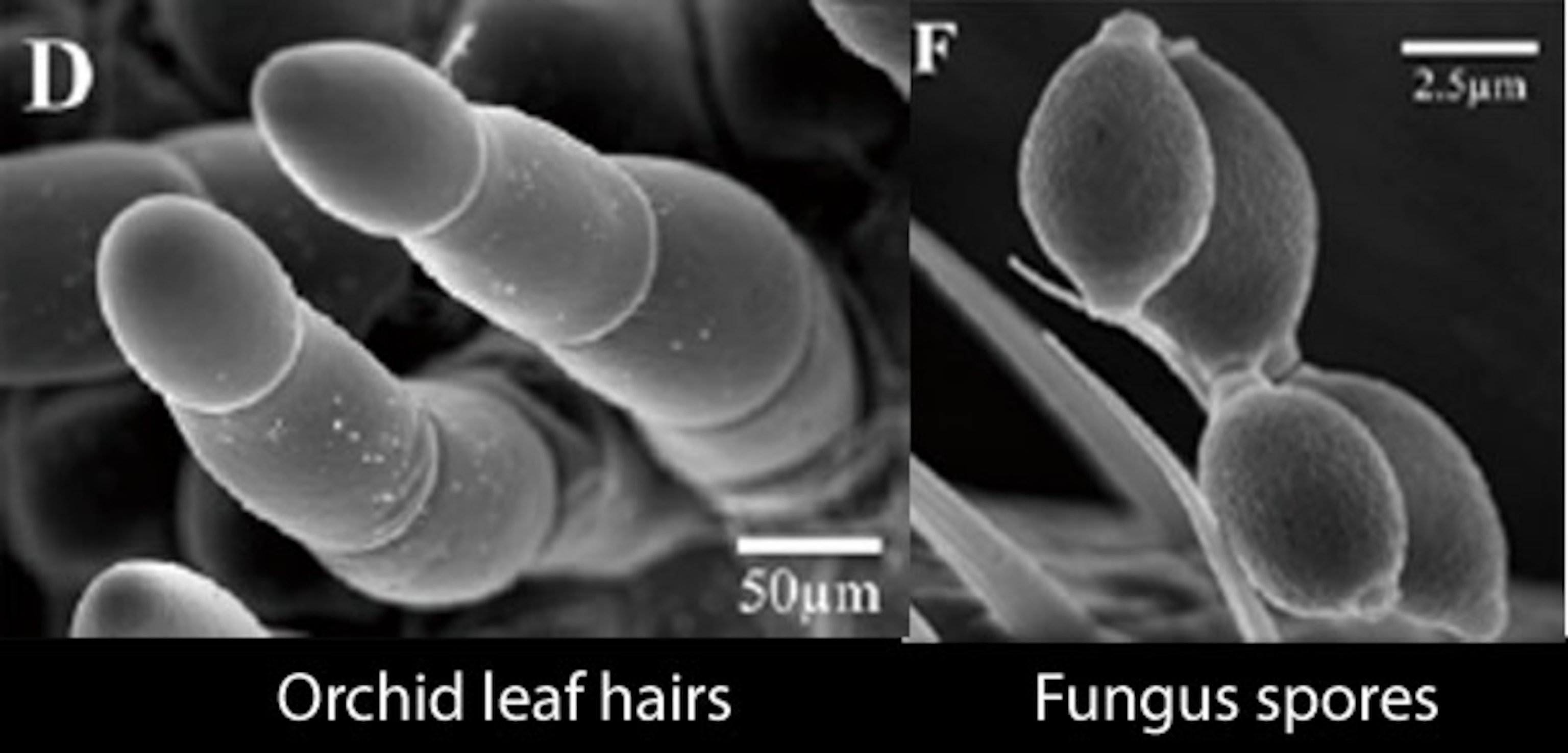 The lady’s slippers are generally pollinated by bees but C.fargesii is different. Over many hours of observation, the only insects that Ren ever saw leaving the flowers were flat-footed flies. Ren captured four of them and when he peered at them under an electron microscope, he saw pollen grains from the orchid, and spores from a fungus called Cladosporium. This fungus infects leaves and fruits, and when it does so, it produces black mould spots. The purpose of the orchid’s black splotches was becoming clear.