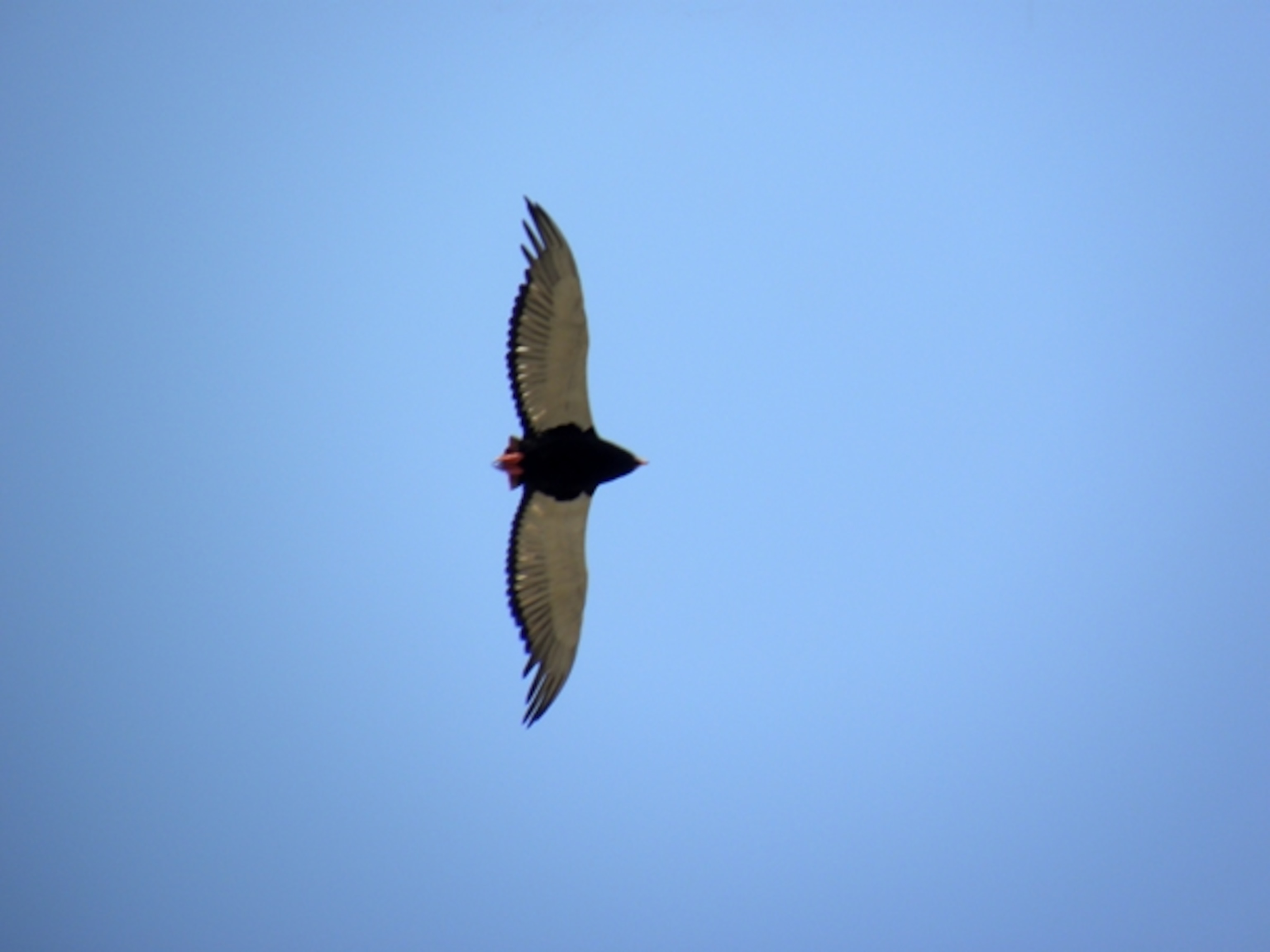 This is a bateleur, an unmistakeable African eagle, with distinctive black, red and white colours and a very short tail. My wife took this photo on our South African safari. I’m amazed at how precise the composition is given that the bird was just circling overhead.