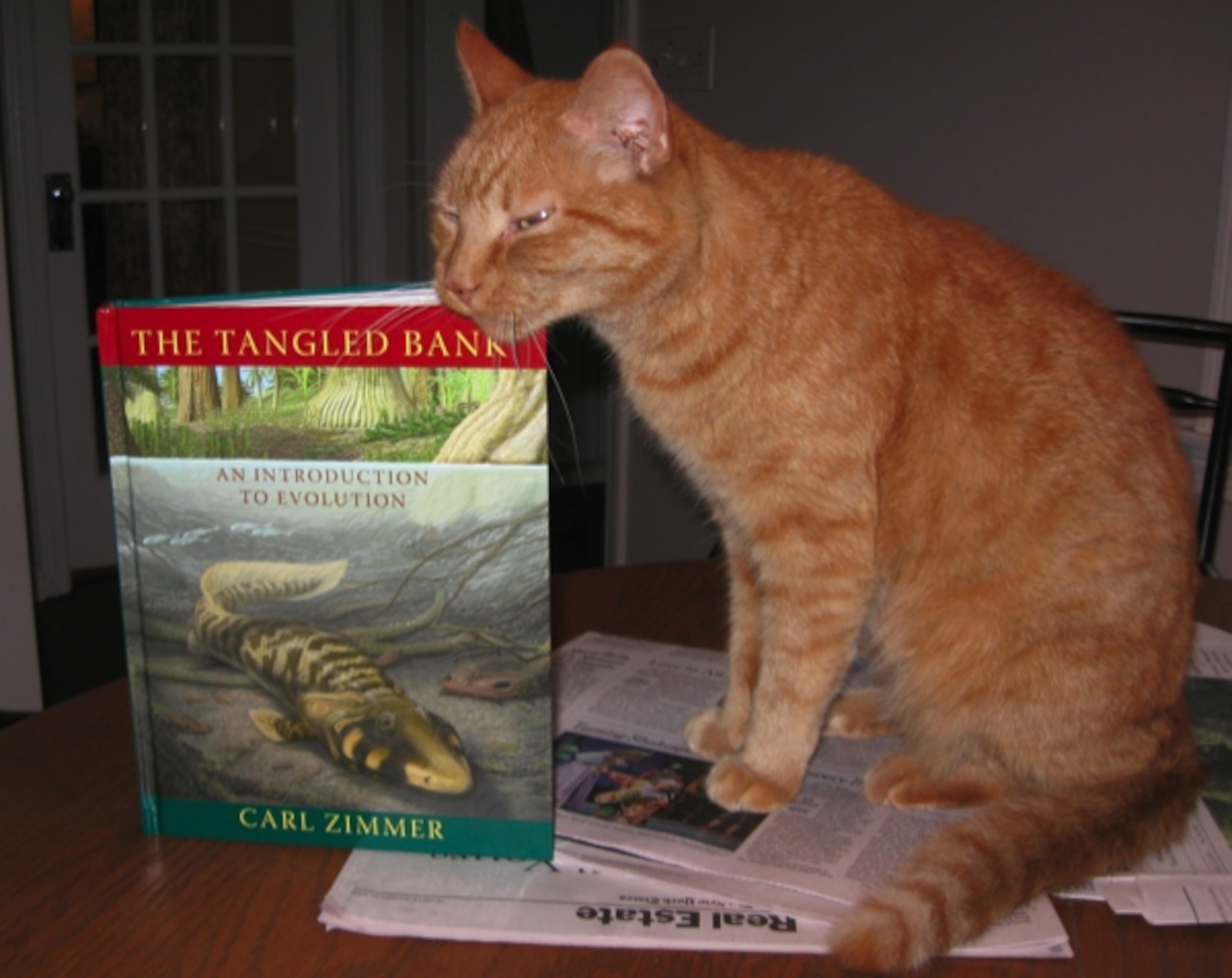 The stork UPS man pitched a box through the front door this morning. Inside was an advance copy of my new book, The Tangled Bank: An Introduction to Evolution. The paternal photographer in me took over, and now I have to show off my snaps. Above is a picture that I like for two reasons. One is the way it shows off Carl Buell’s lovely (and crowd-critiqued) cover. The other is the way it illustrates the book’s far-less-than-a-doorstop mass, which is all too typical for textbooks these days. In fact, the book’s smaller than Tino, our far-less-than-a-doorstop cat.