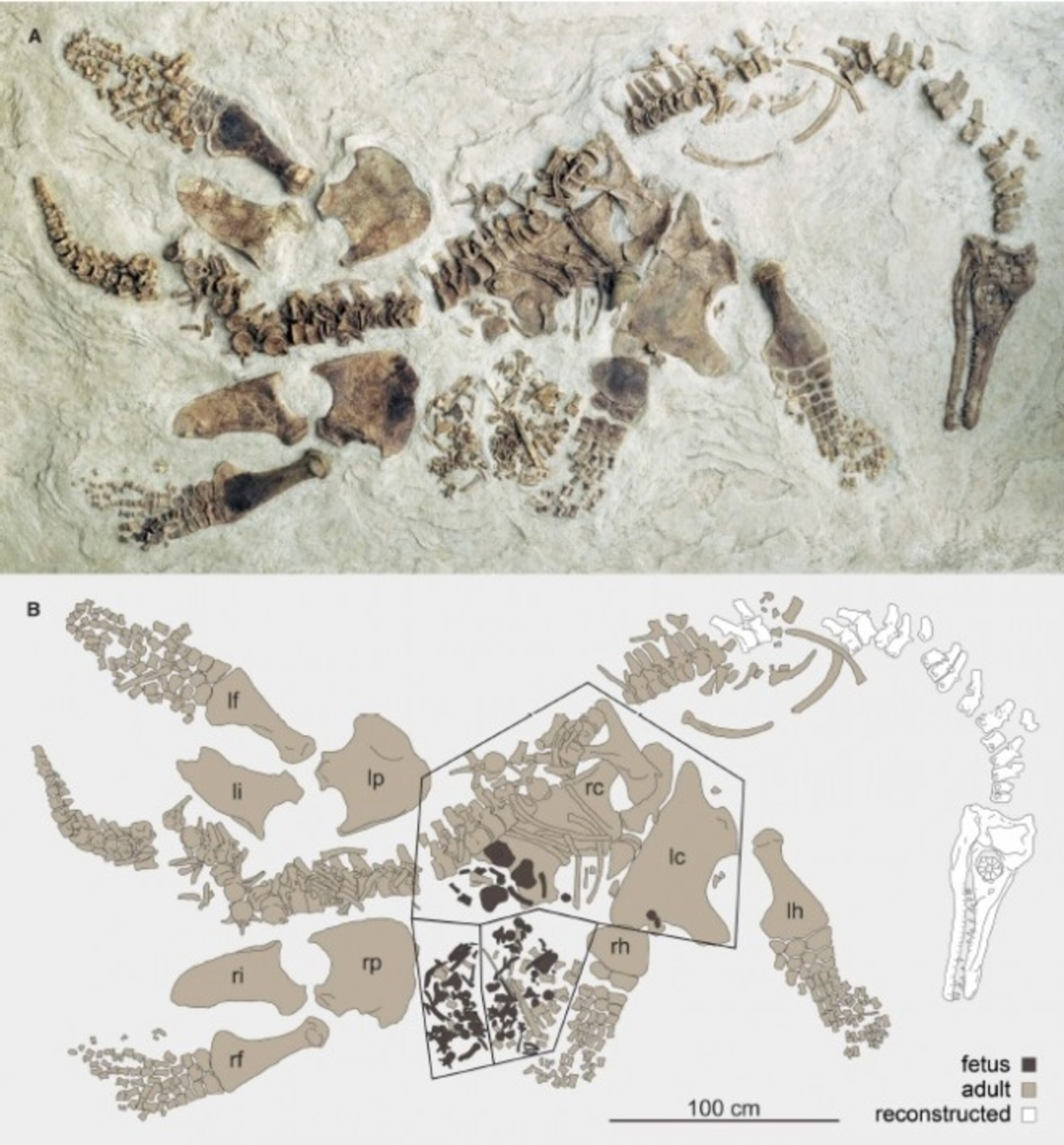Frustratingly, the specimens were excavated, jacketed, and broken up before anyone drew up a quarry map. Even though the finished fossil looks as if fossil hunters simply brushed off the overlying rock, the whole thing is actually a reconstruction put together on the basis of how the plaster jackets related to each other and observations of the excavators. Still, there are a few clues that indicate that the smaller animal is, in fact, an embryo preserved close the position it occupied inside its mother.