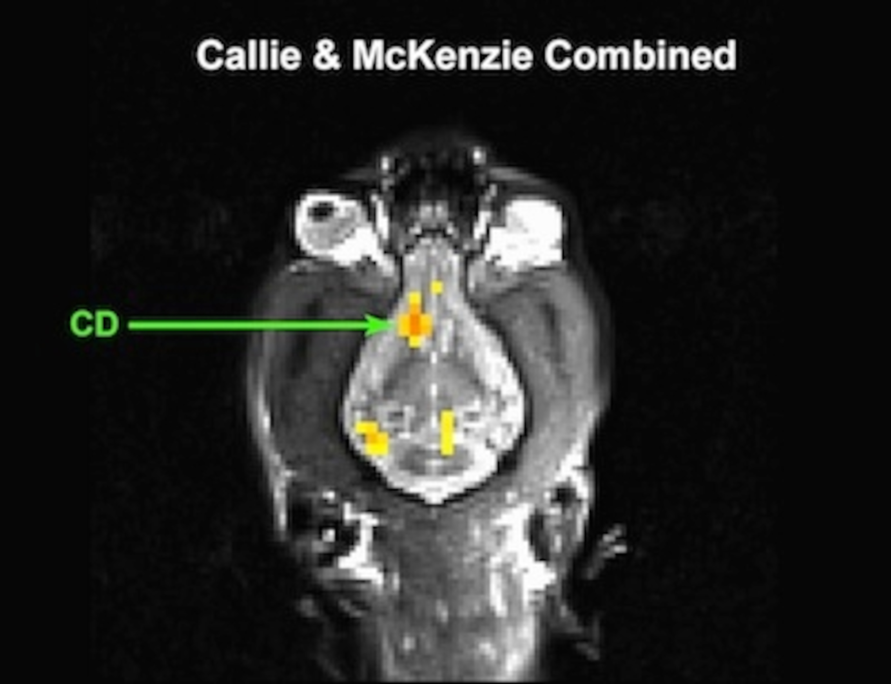 Of course, dog brains are shaped differently than human brains, so finding it took some work. But once they did, they found a satisfying pattern: when the handler made the hot dog sign, the ventral striatum showed higher levels of activity. (In this picture it’s marked CD, standing for the caudate cluster, in which the ventral striatum is located.) When the handler made the no-hot-dog sign, on the other hand, the ventral striatum remained quiet. Interestingly, McKenzie the border collie had a much stronger response than Callie.