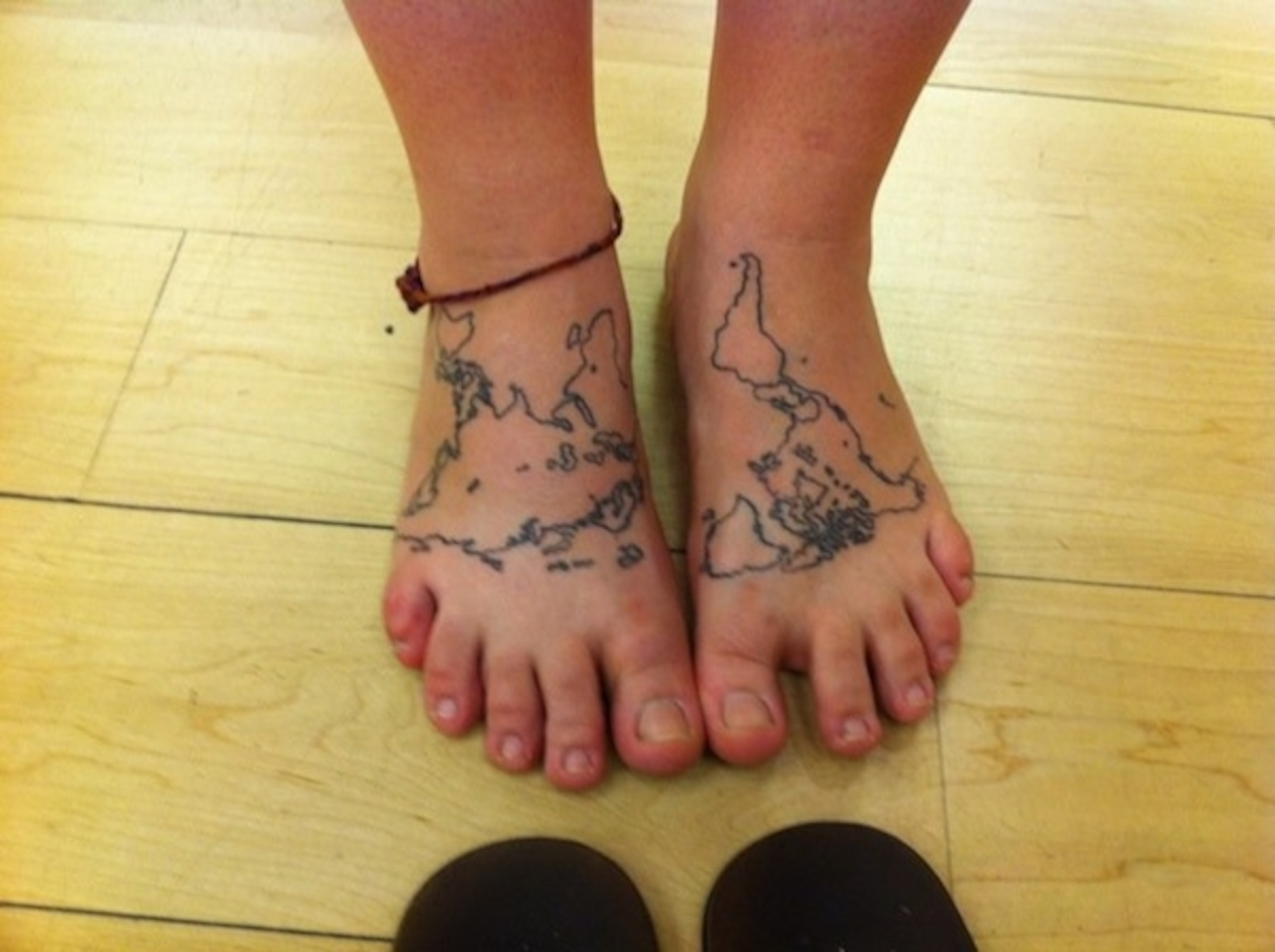 I’m a student at MIT in the Earth, Atmospheric & Planetary Science Department hoping to solve the glacially-coupled climate problem of global warming by developing efficient carbon sequestration technology. In honor of our beautiful mother Earth, and as a constant reminder of the places I can go under my own human power, I had the world map, minus Antarctica, tattooed on the tops of my feet in a Mercator projection.