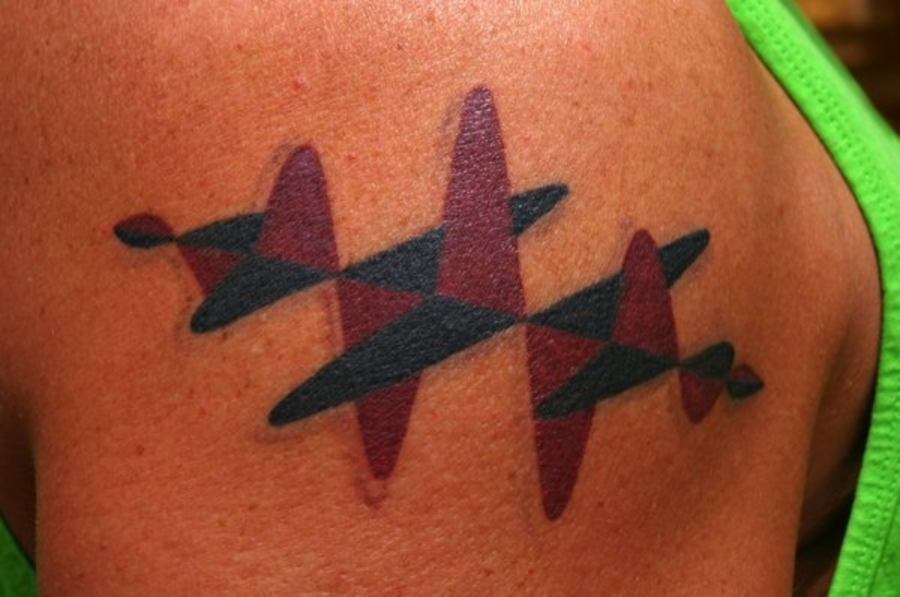 The right shoulder tattoo [CZ: above] is a 3D perspective abstract view of a gaussian photon, a “particle of light,” the red vertical undulations represent the electric field, the black horizontal undulations the magnetic field. It is propagating to the right, seen here as a snapshot in time. The photon is the single most common manner in which information is transmitted from one place in the universe to another. The tattoo artist suggested adding the faint shadows to give it depth, but the real reason I agreed was the ironic (oxymoronic?) humor of a particle of light casting a shadow.