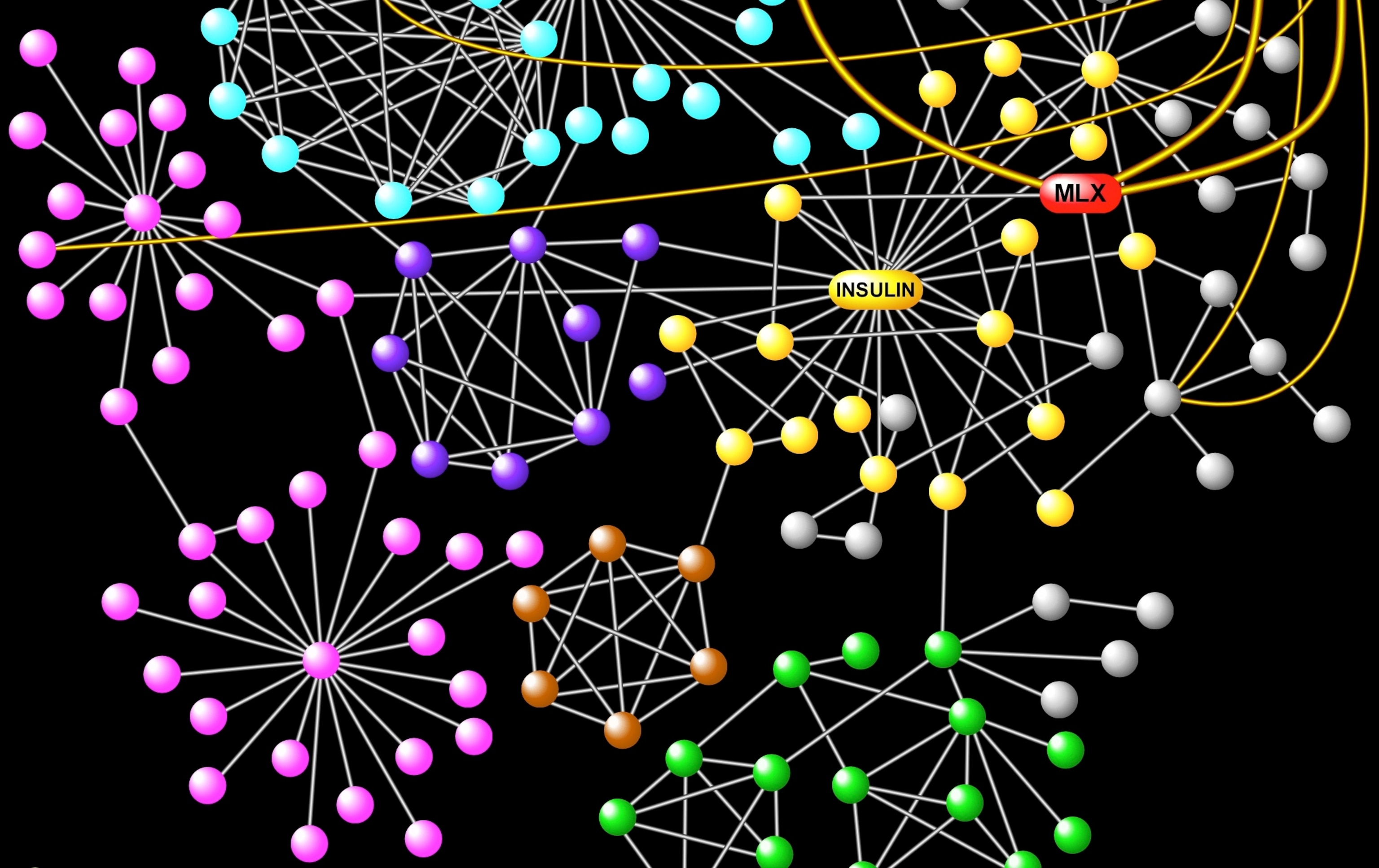 The proteins that make up our cells work in modules, too. Some proteins can only work in collaboration with certain other proteins. They may need to join together to make a channel, for example, or they may help out in an assembly line of chemical reactions that breaks down a toxin. You can draw a map of these interactions by connecting lines between genes that are turned into proteins in the same situations. The modules look like dense nests of links, with a few links joining together one module to another.