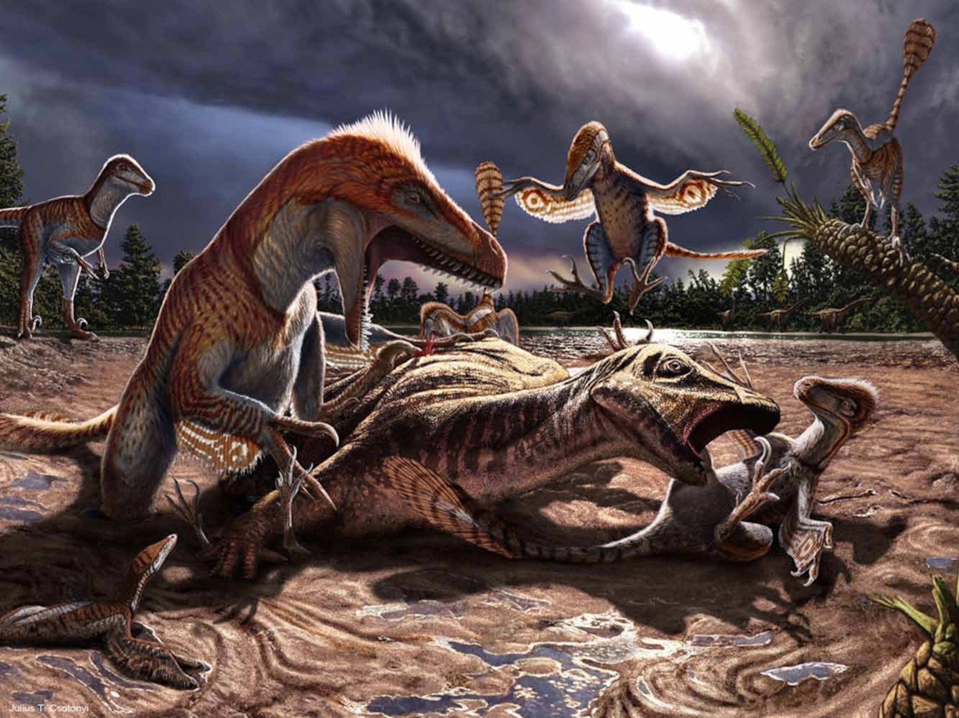 Paleontology is a kind of time travel. It isn’t quite as fast as Emmett Brown’s DeLorean or as swanky as the TARDIS, but standing on the vestiges of ancient environments, picking out remnants of prehistoric life, nevertheless allows us to see through the ages. Bit by bit, all those geological and biological pieces come together to let us trace images of what life was like during the distant past, and artist Julius Csotonyi is exceptionally talented at visualizing what lies at the intersection of science and speculation.