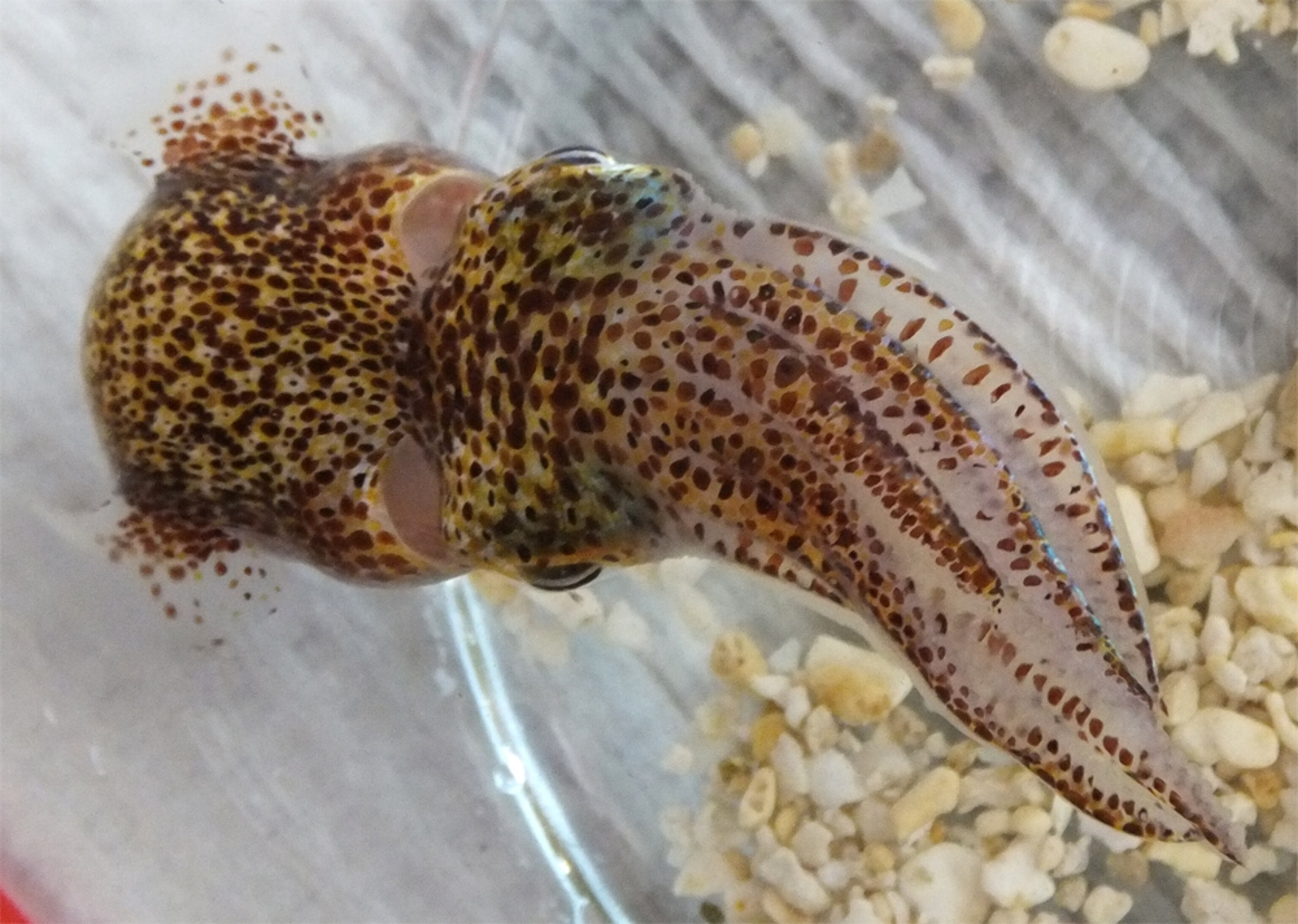 The aquarium looks empty, but there is something in it. A pair of eyes stick out from the sandy floor, and their owner is easily scooped up into a glass bowl. At first, the creature looks like a hazelnut truffle — small, round and covered in tiny flecks. But with a gentle shake, the flecks of sand fall off to reveal a female Hawaiian bobtail squid (Euprymna scolopes), about the size of a thumb. As she jets furiously around the bowl, discs of pigment bloom and fade over her skin like a living pointillist painting.