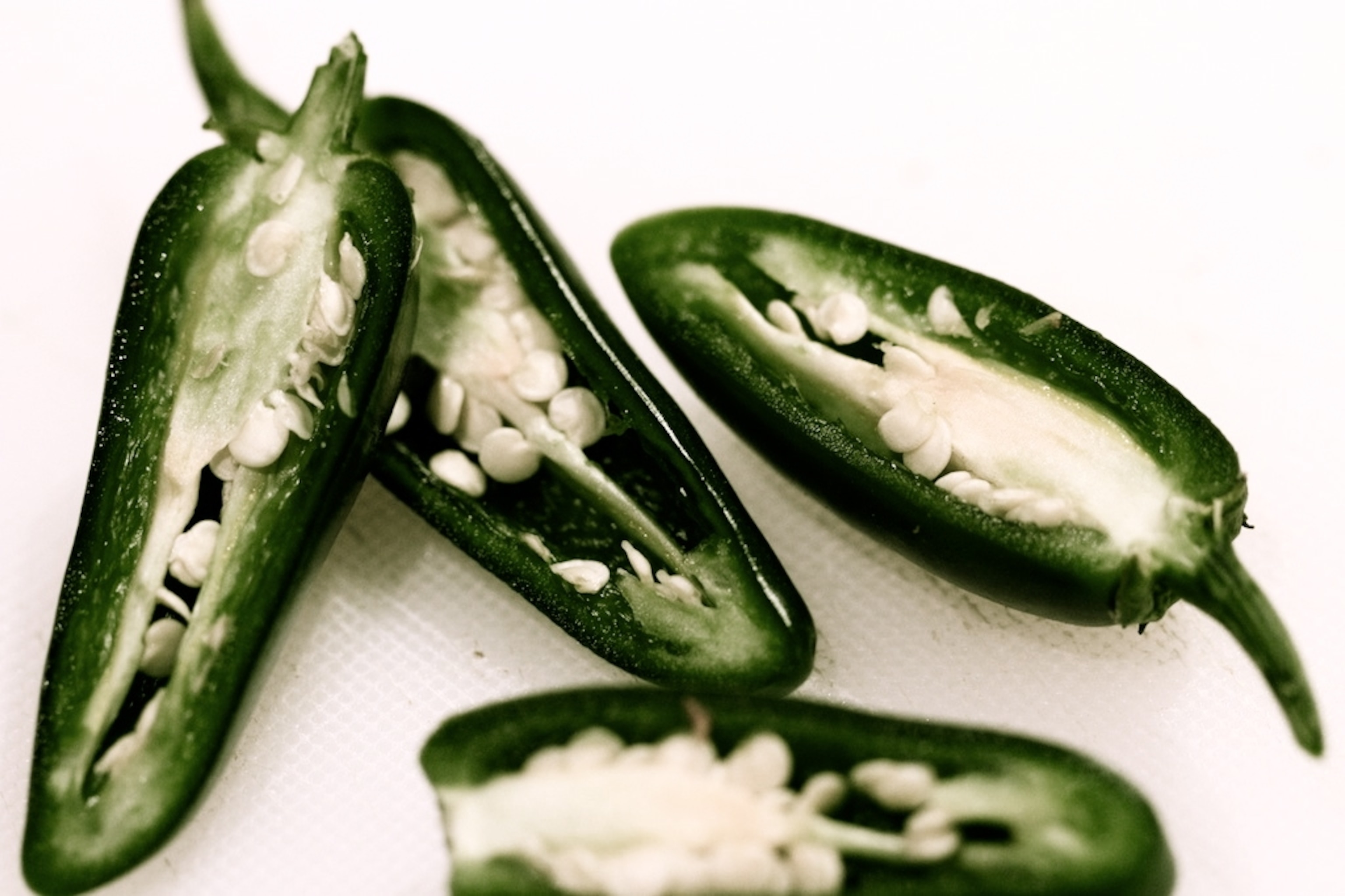 The stuff that makes jalapeños hot is a colorless, odorless compound called capsaicin, found mostly in the white pith that connects the seeds to the shell. Capsaicin works by binding to ‘TRPV1’ receptors in your nerve cells, which in turn sets off pain messages. Inside your mouth, small amounts of capsaicin makes for a pleasantly tingling spice, which I happen to love when mixed with the salt of a tortilla chip. But when rubbed in large quantities over both sides of both hands, capsaicin feels like a bad, bad sunburn.