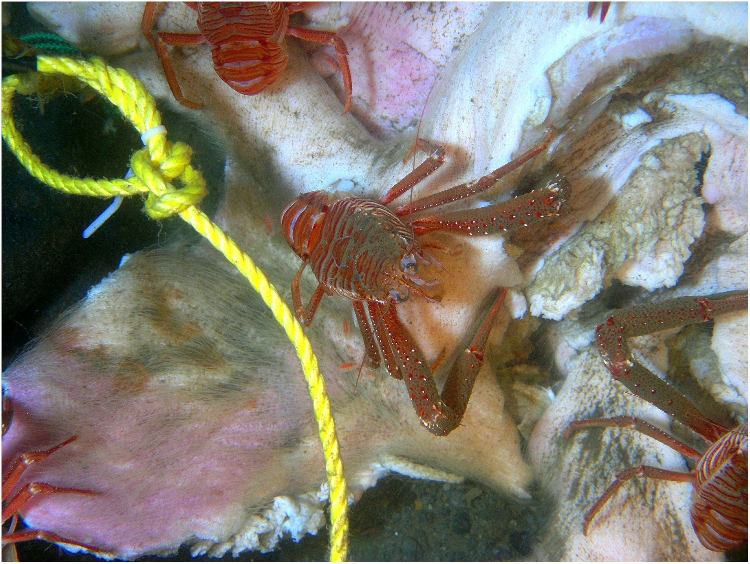 Within minutes of placement, large numbers of Munida quadrispina Benedict (squat lobsters, Family Galatheidae) arrived at Carcass 1 and 2 and began to pick at the skin, attracted to the entire carcass, with some preference for the orifices. Scanning the camera around the area showed that very large numbers of M. quadrispina were actively moving towards the carcasses from all areas.