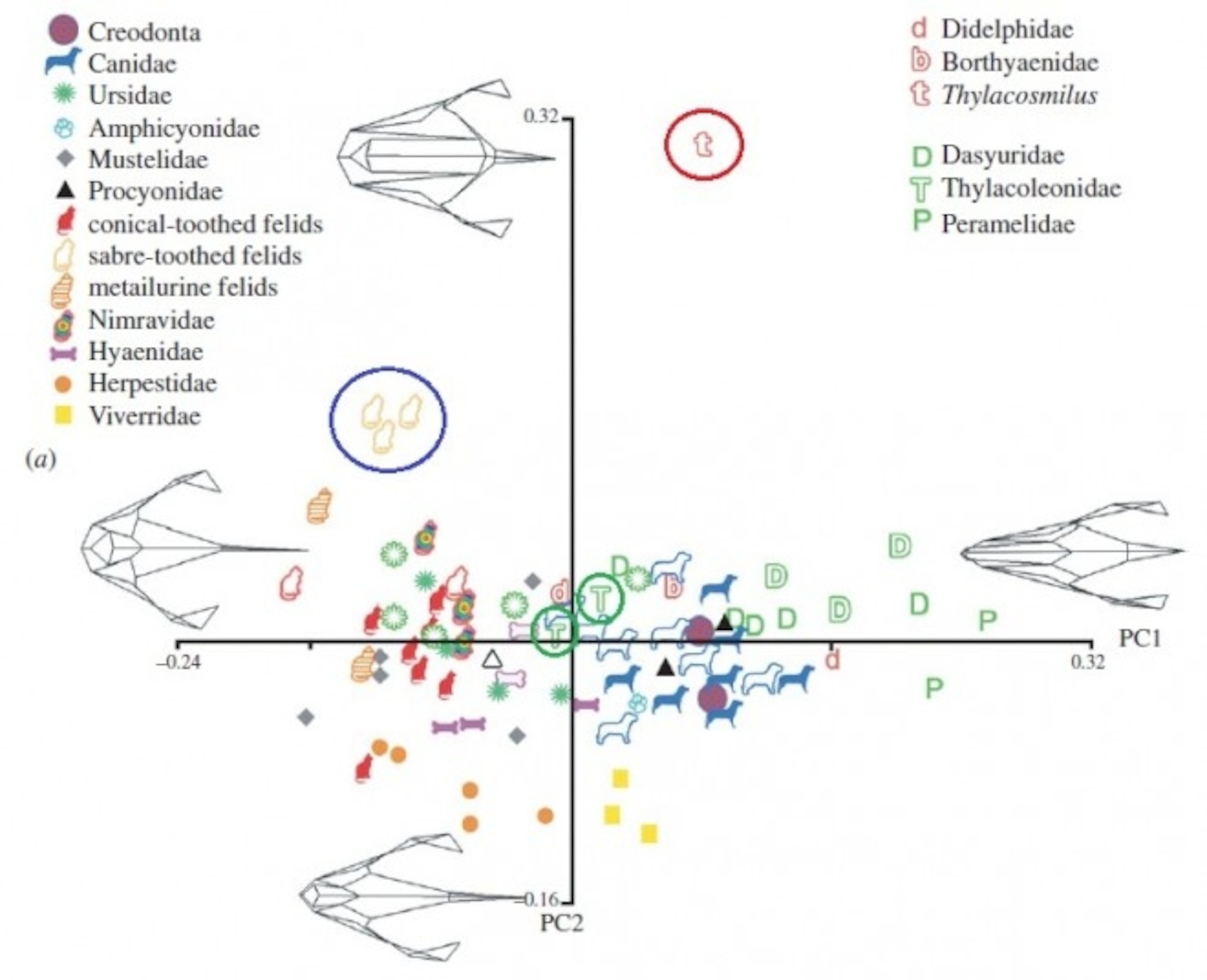 While the distribution of skull shapes might look scattershot at first glance, a few patterns are apparent. Despite the idea that their evolution had been constrained, the skull shapes of the metatherian predators were widely distributed and even showed indication of shifts over time. The skulls of opossums, quolls, and thylacoleonids had skulls most similar to living and extinct dogs, and the quolls showed a shift from more dog-like skulls in extinct species to longer, narrower, insectivore-like skulls in modern species. In concern to Thylacosmilus, it again came out as distinct even when compared to other metatherian predators. Its long, broad, and deep skull was closest in shape to that of the prehistoric dog Enhydrocyon. The distribution also showed that – despite their common names “marsupial lion” and “marsupial sabertooth” – the skulls of the metatherians Thylacoleo and Thylacosmilus were far more dog-like than cat-like. If anything, cats were outliers in respect to their skull shapes, most closely approximated by bears and hyenas.