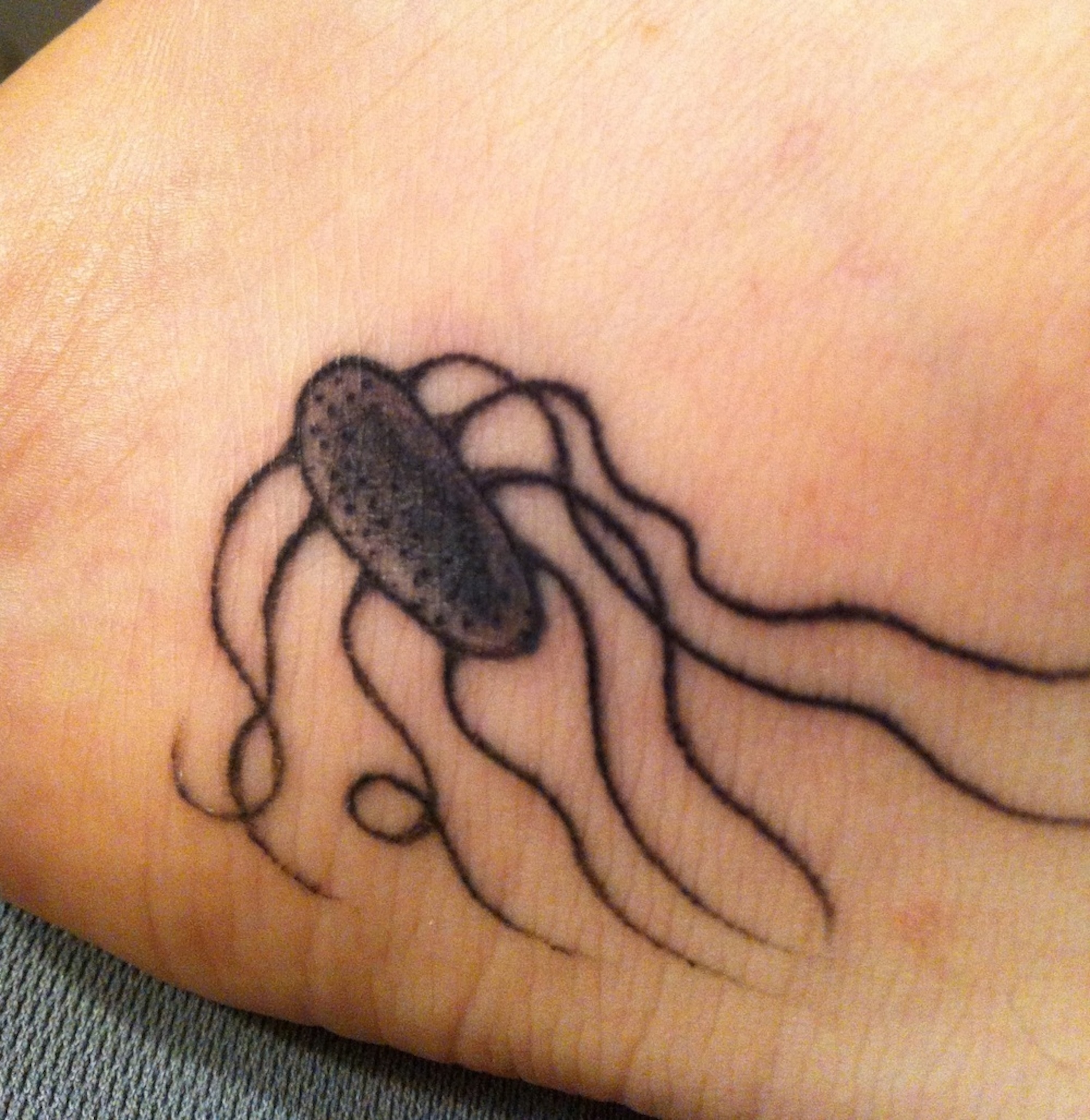 “While nervous at first, I was very pleased with his conturing of the peritrichous flagella around the natural curves of my ankle. As any good artist, Scott wanted to add more details and begun tattooing what to him were dots, but to me were outer membrane porins or pili. He also decided to shade the cell wall core.