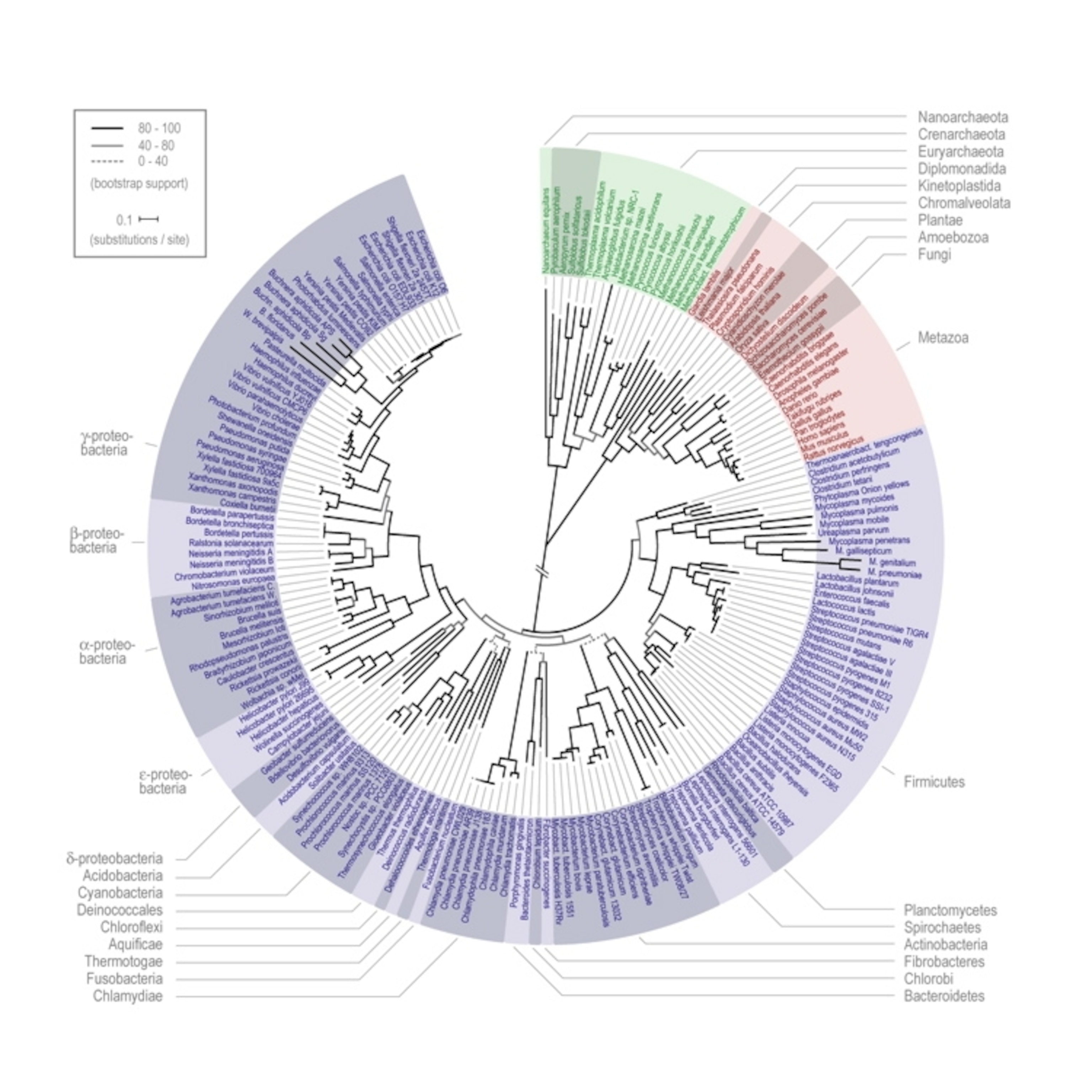 The scientists took advantage of the fact that so many genomes have been sequenced over the past decade, and that it’s now possible to compare the DNA in different genomes relatively quickly (if you have a supercomputer, of course). Their strategy was to search for all the genes that could offer the clearest clues to the tree of life–genes that had not been swapped too much between species, for example. They searched the genomes of 191 species of animals, plants, fungi, protozoans, bacteria, and archaea (microbes that look superficially a lot like bacteria). They selected 36 universal genes, but then tossed out five of them because they appear to have been swapped.