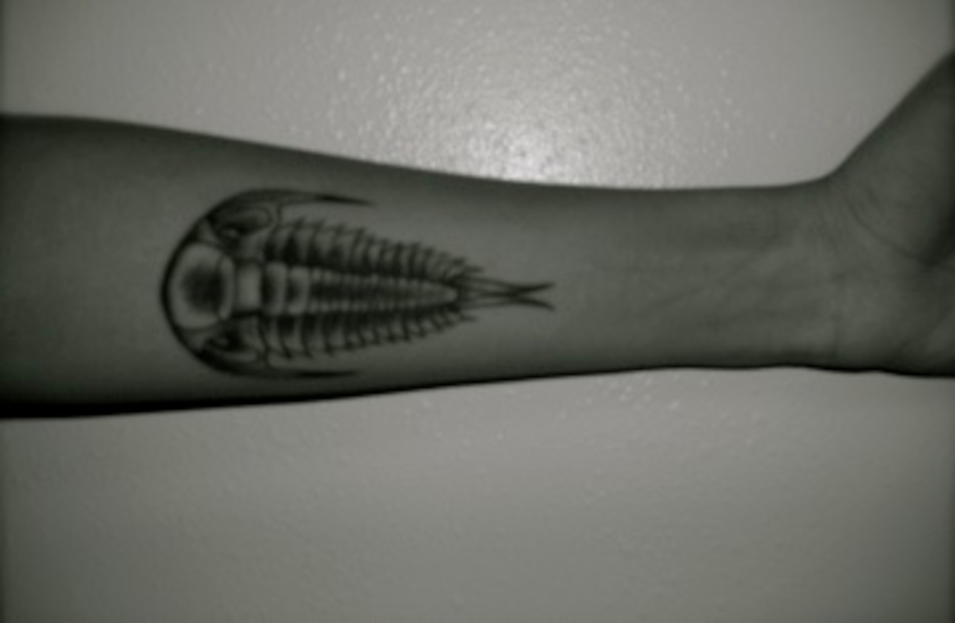 “I am a currently a neuroimaging research assistant and I used to work in inorganic chemistry. I got this tattoo after I took a philosophy class on the origins of life, which turned out to be an intelligent design class in disguise. The geological record was always being disputed in class. This is my political statement against intelligent design being taught in schools. This tattoo shows my support of the geological record and evolution, as well as my love for trilobites and other ancient marine creatures. It is based on the species paradoxides davidis. I am going to get a similar tattoo on the other arm of a fossilized leaf, so that I have both the flora and the fauna.” — Judith Segall