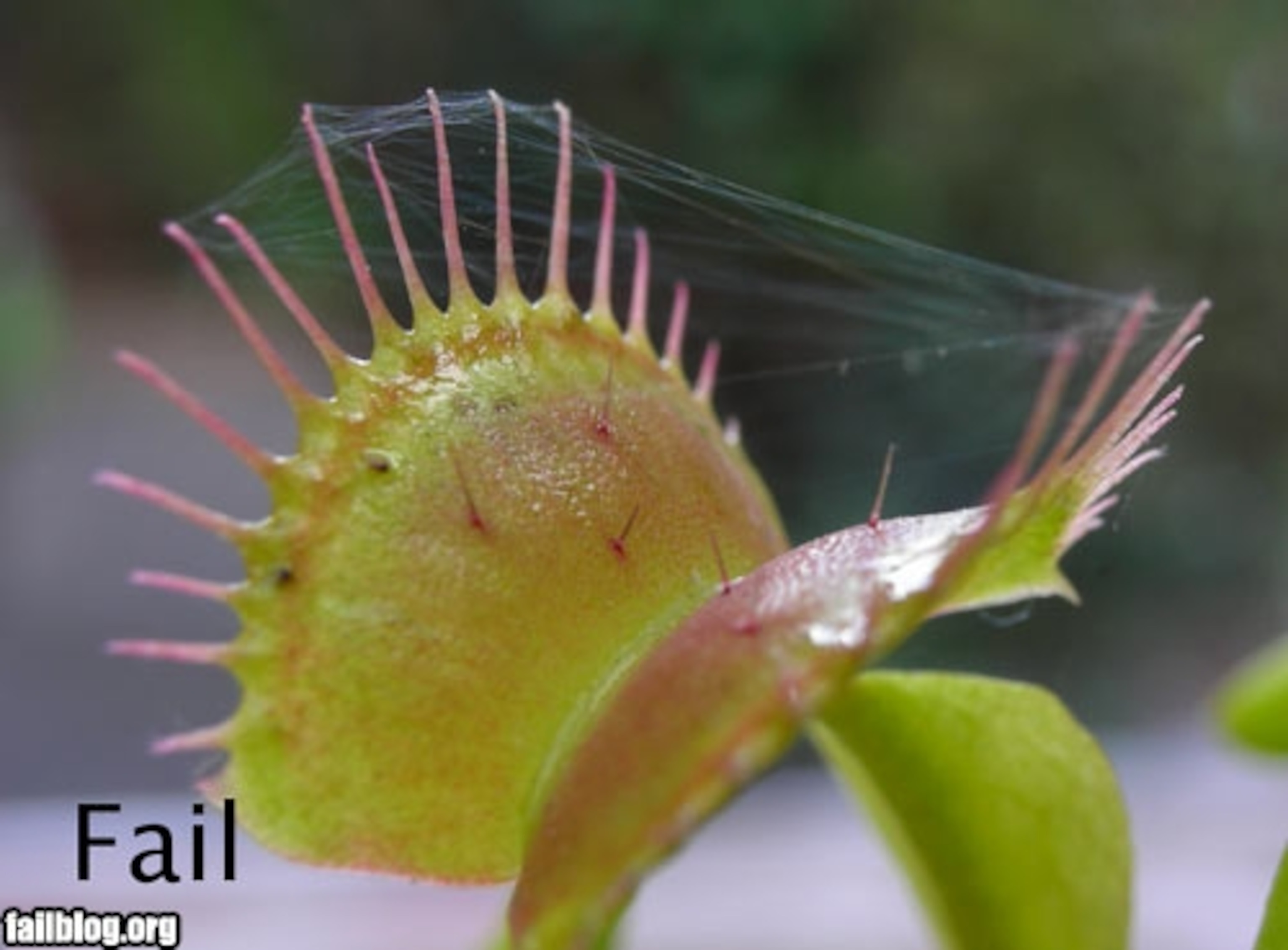 Now, it’s understandable that the Venus Flytrap – a carnivorous plant that catches insects – isn’t doing that well out of this situation, but I submit to you that it’s a win for the spider. The flytrap attracts insects to its hinged leaves by baiting them with a sweet nectar, and what better place for a spider to spin its web than a ready-made insect lure?