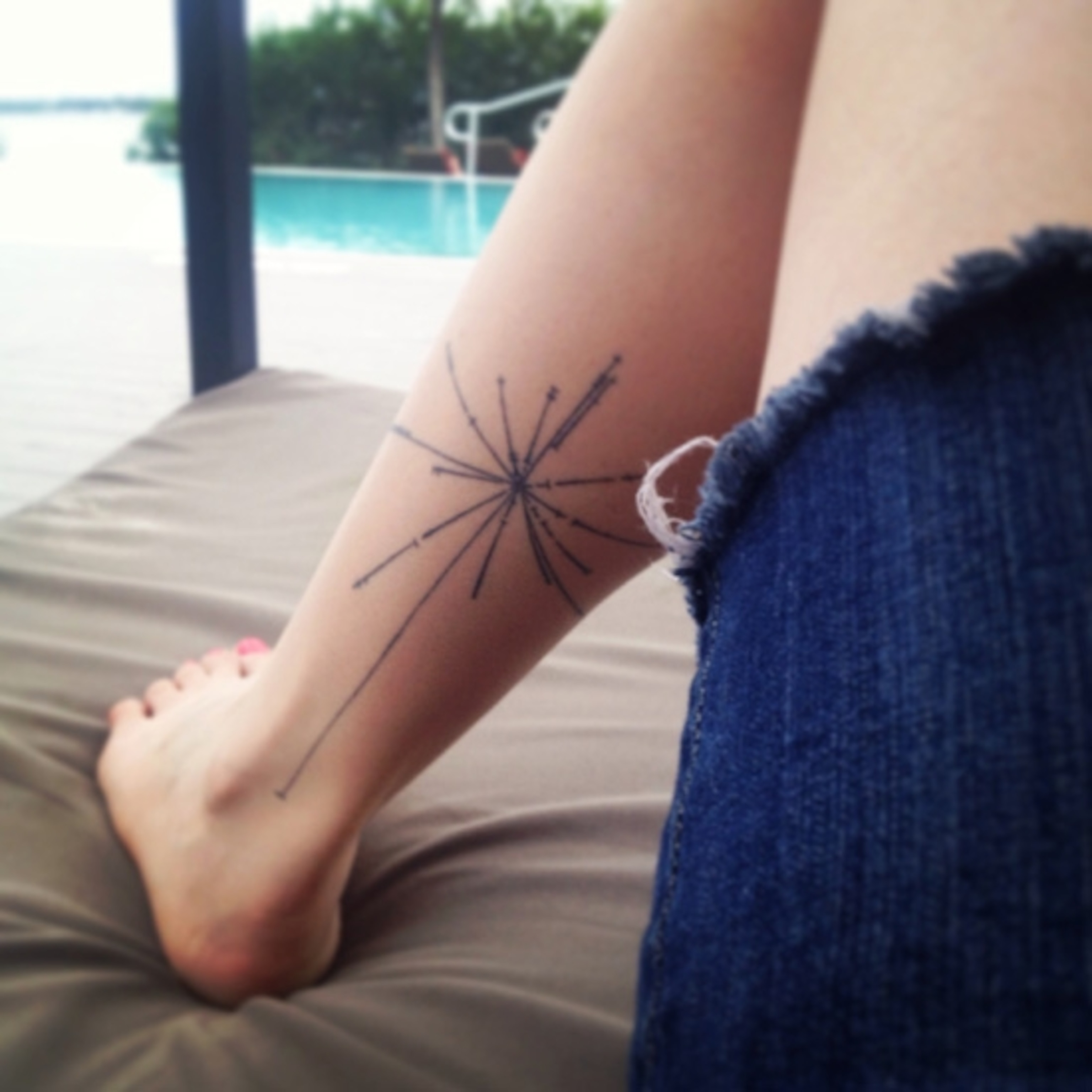 Writer Jaime Green writes, “Here is my contribution to the collection, my tattoo of the pulsar map from the Voyager golden record, tattooed by the awesome Joseph Ari Aloi. A high point of my life was getting to show it to Frank Drake.”