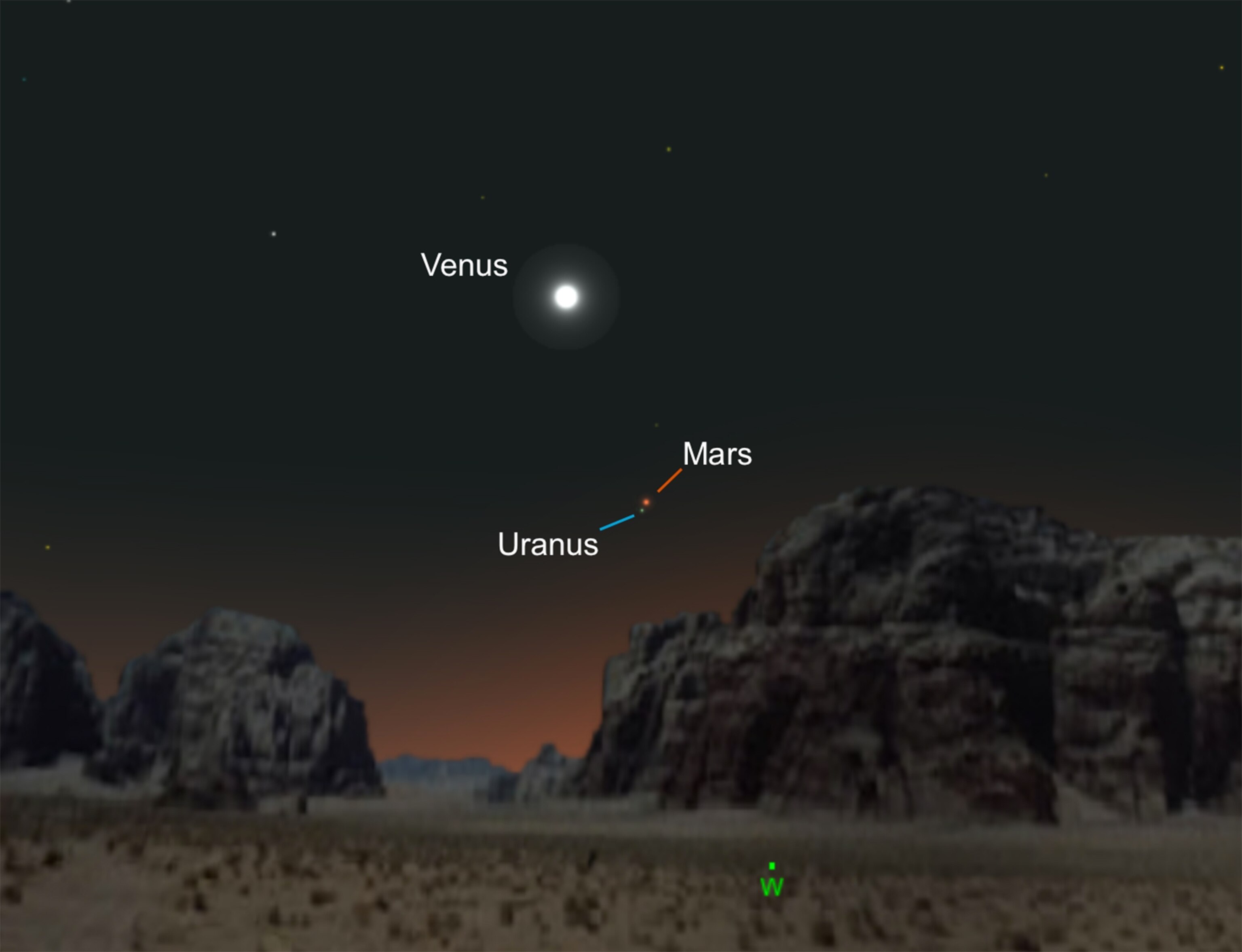 Venus will appear as a bright star low in the western skies. Just below, at about 10 degrees (equal to a fist held at arm's length), will be Mars. And close in tow will be the green giant Uranus to the south. Uranus won't be visible to the naked eye, but the planet will appear so close to Mars that it will be seen in the field of view of a small telescope.
