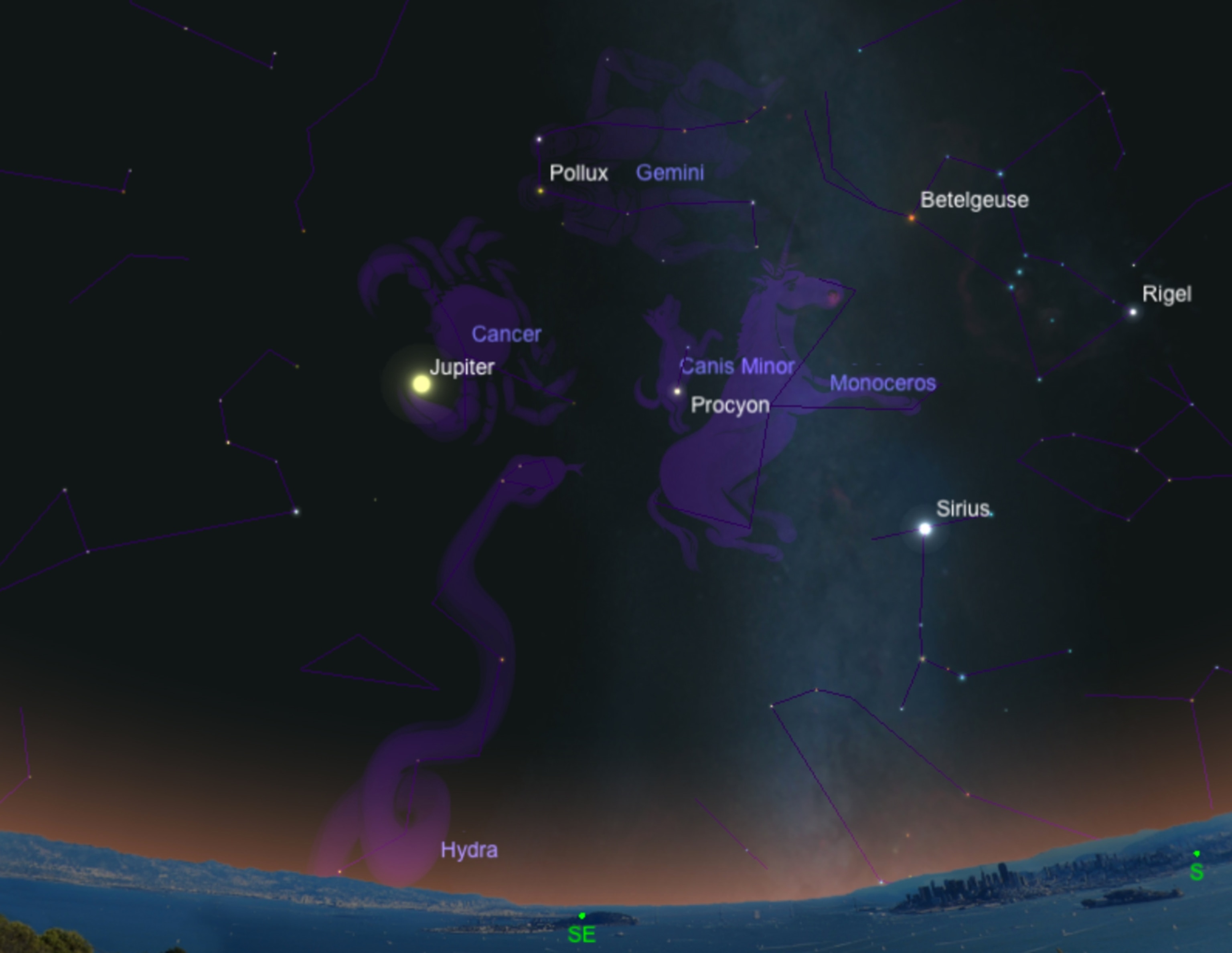 Jupiter's Triangle. To see the stars Procyon and Pollux creating a triad with Jupiter, face the southeast just after dark on Tuesday, March 10.