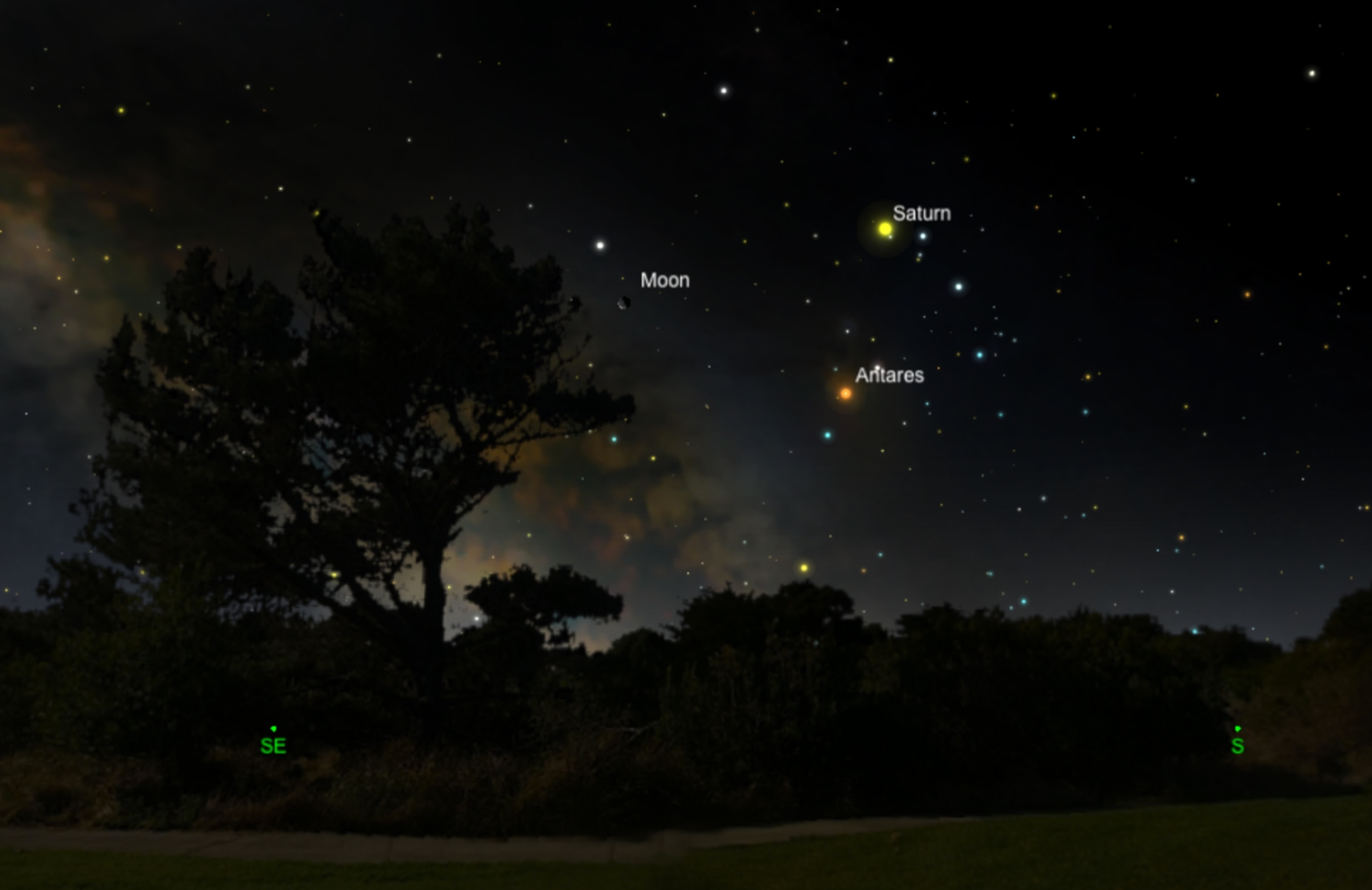 Saturn will look like a yellow star in the sky, just to the upper right of the moon, now in its gibbous phase. As an extra treat, at about the same distance to the lower right of the moon, will be the bright white Antares.