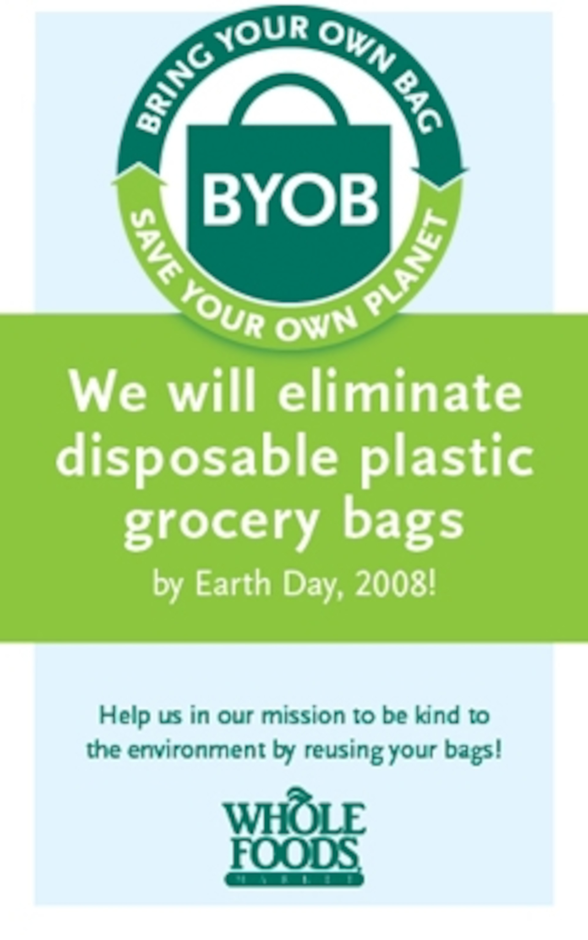 Whole Foods has announced their goal to eliminate all plastic grocery bags by Earth Day (April 22). The grocer, which features natural and organic foods, said it hoped shoppers would bring their own reusable bags, but would offer 100 percent recycled paper grocery bags when needed.