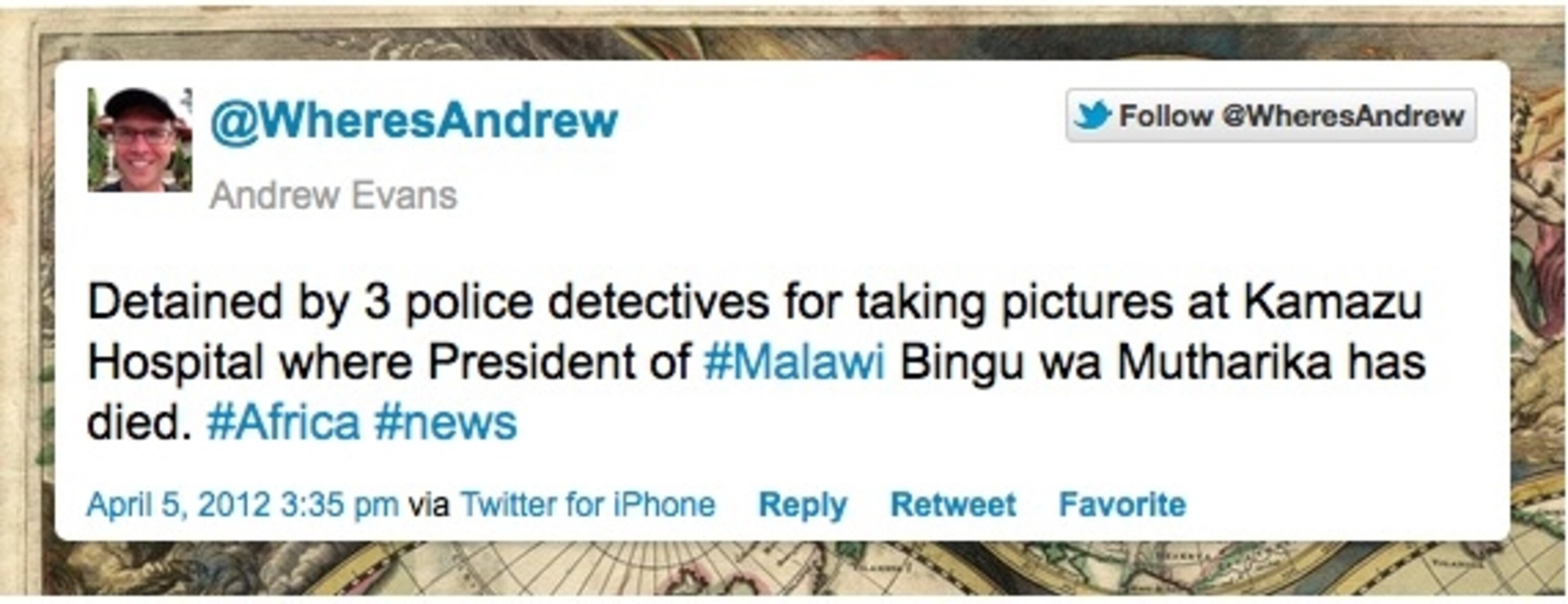 I first heard the rumors about the president’s failing health outside a sugar ration line in central Lilongwe, the capital of Malawi, where I was told that the he had collapsed and was now in a coma. I immediately tweeted what I had heard (#unconfirmed) and then began to follow leads that popped up on Twitter.