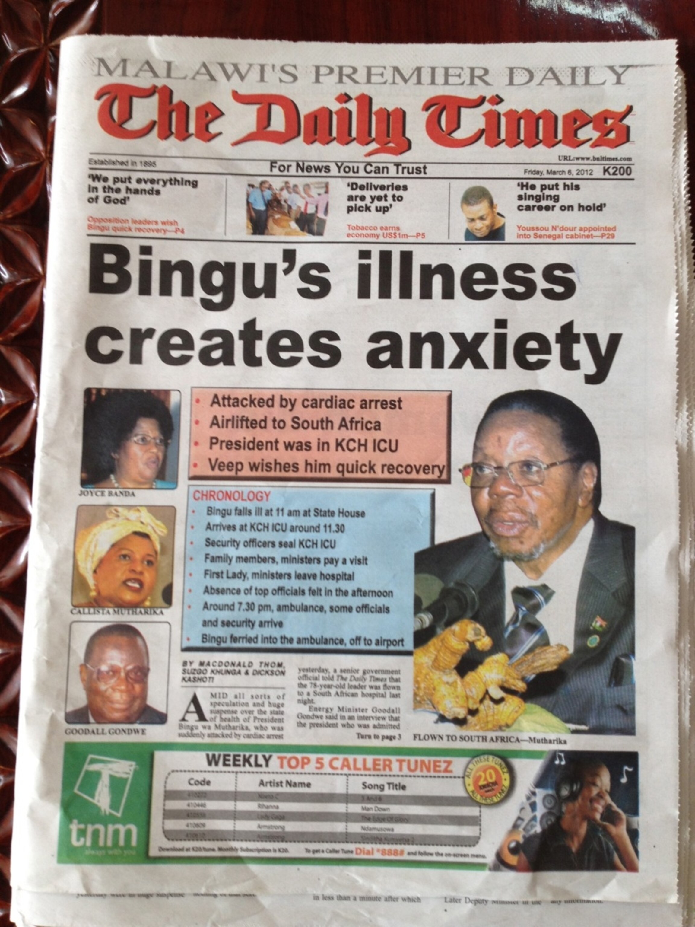 On a table in the airport lounge sat today’s newspaper, the Daily Times (“Malawi’s Premier Daily”) announcing today’s headline, “Bingu’s Illness Creates Anxiety” while at the very same time, the BBC World Service blared President Bingu’s death from television screens, “President Bingu has died of a heart attack.”