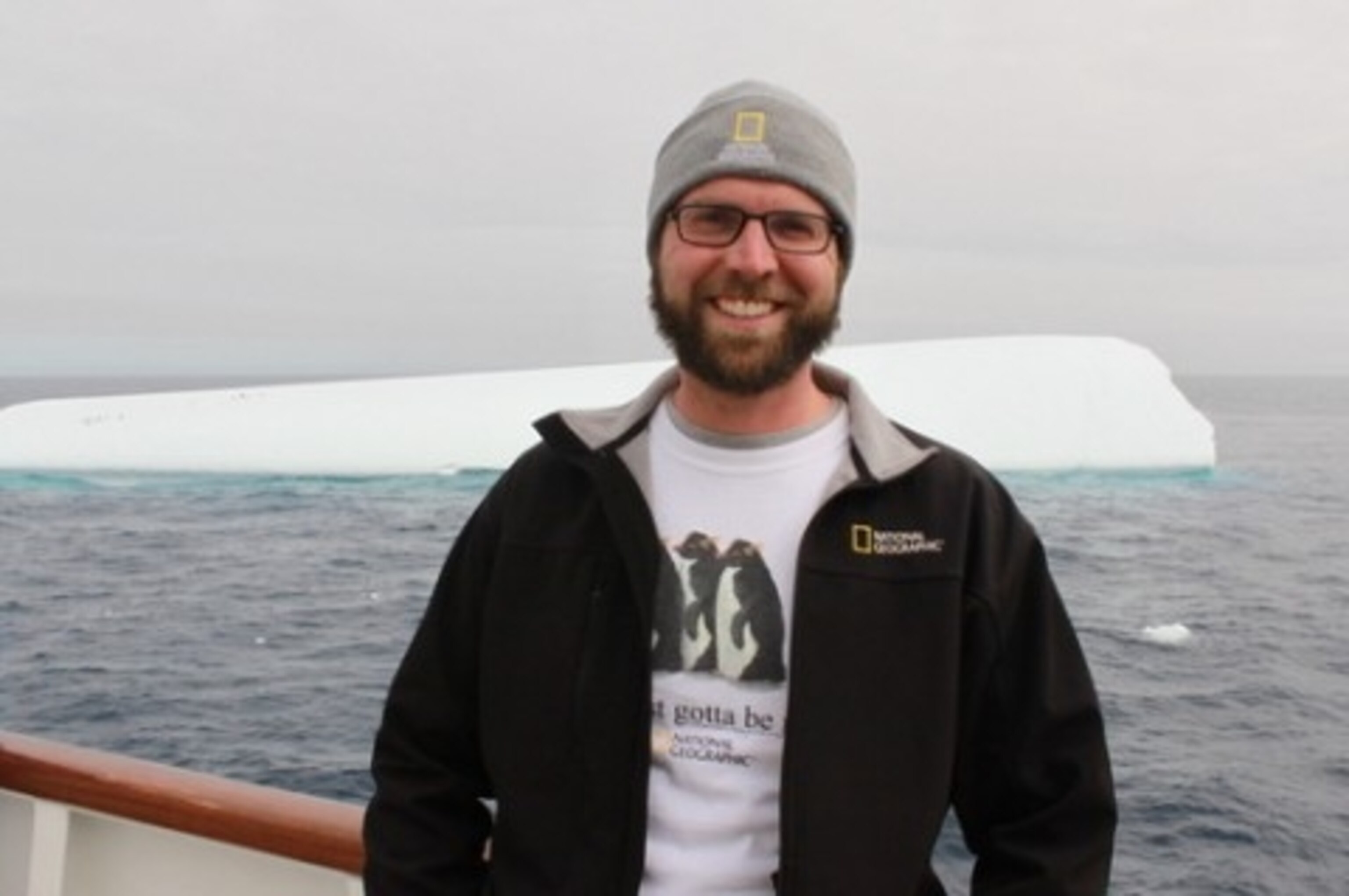 Andrew Evans encounters his first iceberg on his way to Antarctica (while wearing a penguin shirt, naturally).