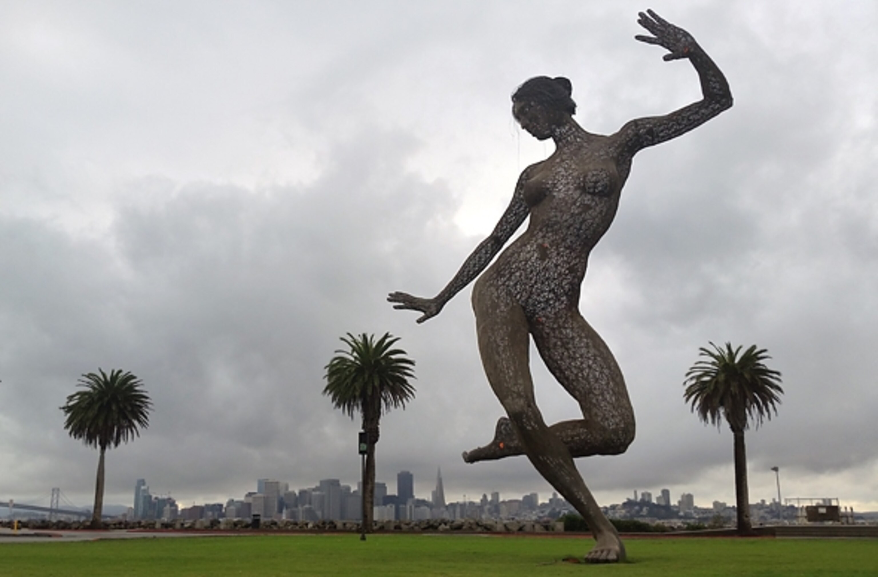 Afterwards I walk past a bayside churro stand on the well-named Avenue of the Palms, looking back to see that San Francisco is enduring rain while I enjoy pockets of sun. A couple hundred yards down the path, I see the 45-foot “Bliss,” a 2011 stainless steel mesh figure of a dancing woman built by artist Marco Cochrane, who works on the island. (A year ago, rust started to wear on its skeleton and the artist raised nearly $20,000 to add a coating protecting it from the sea air.)