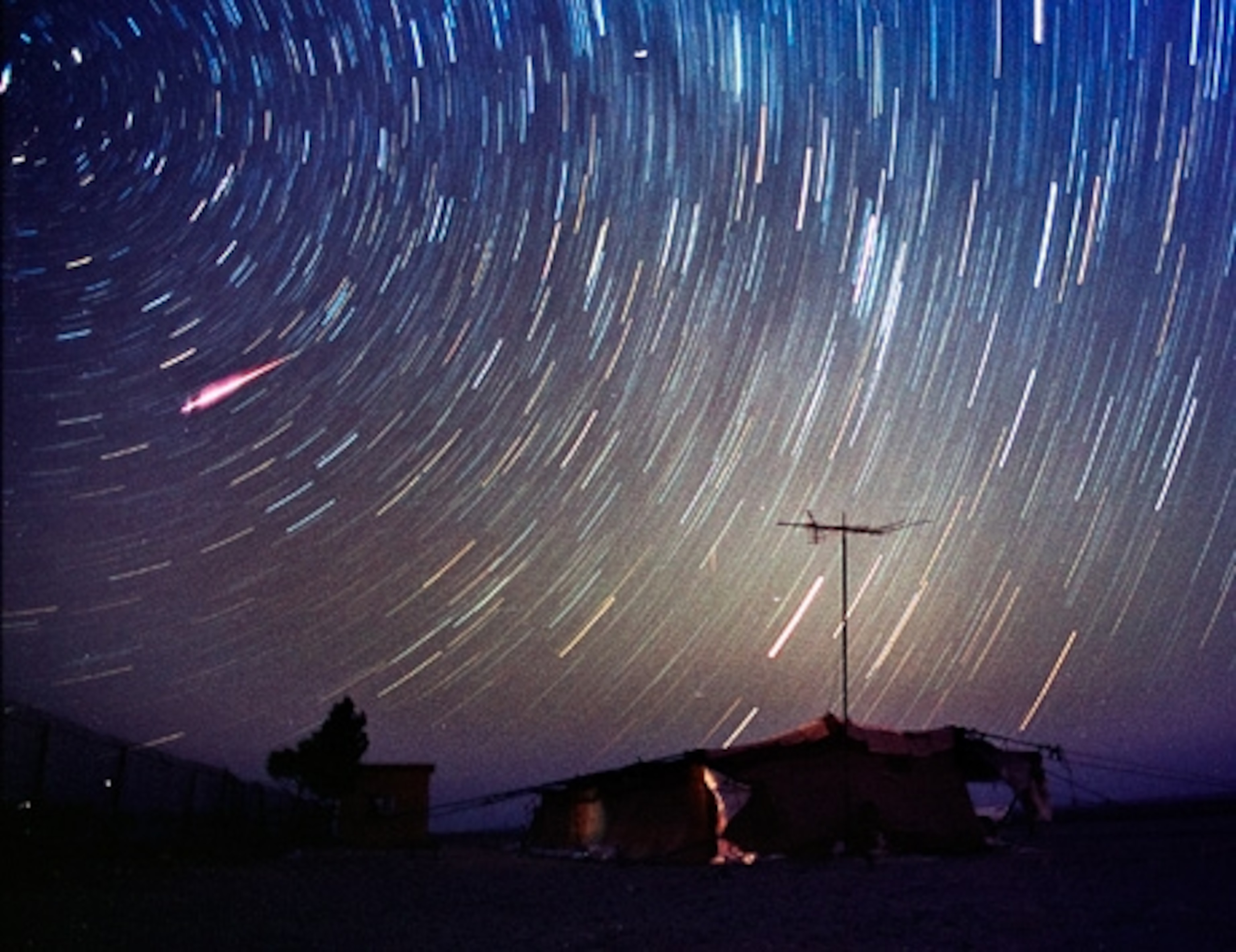 Meteors brighten the night sky over a Bedouin tent near Amman, Jordan, on August 12, 2004.