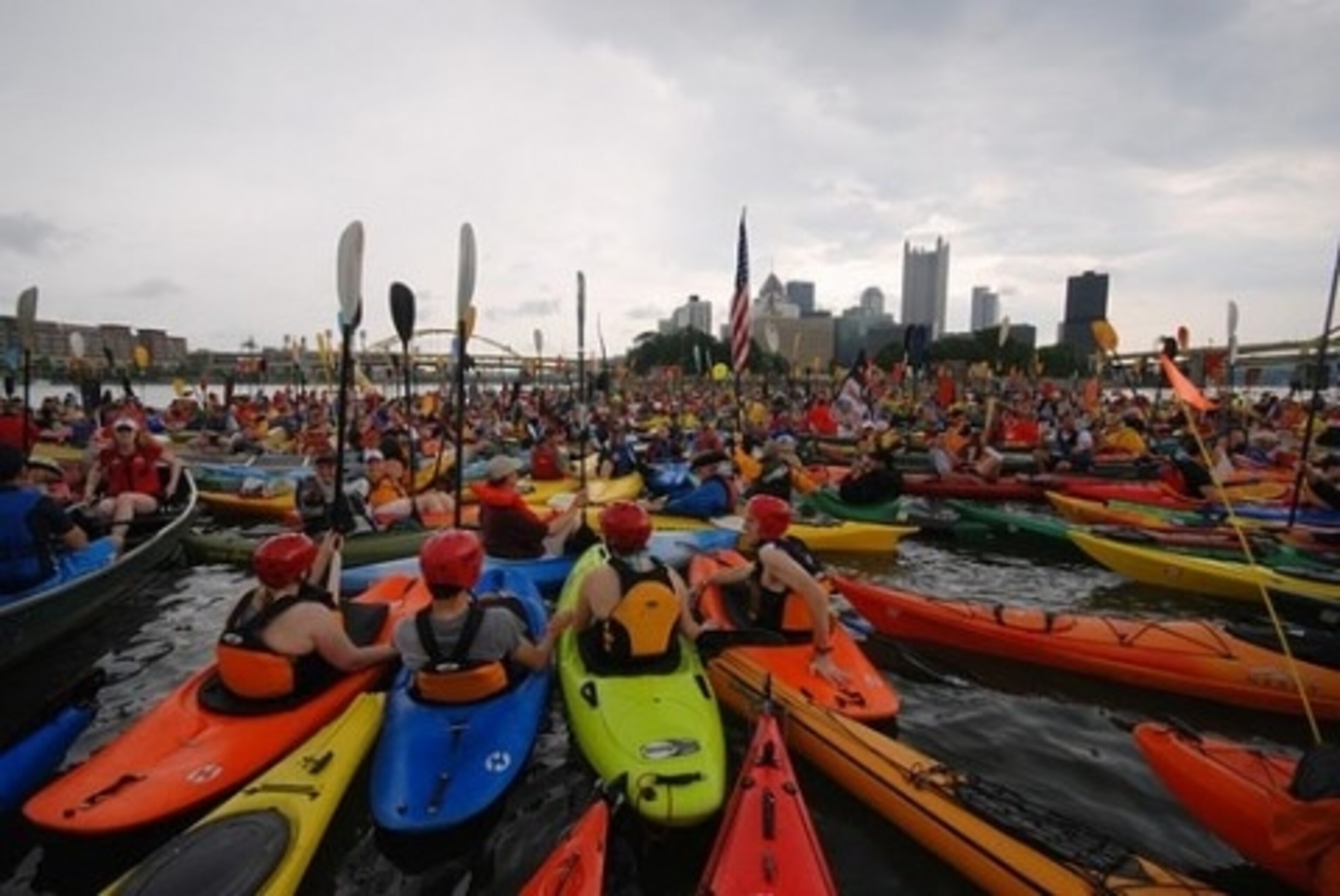 As blue anvil clouds lowered over downtown Pittsburgh Saturday, nearly 2,000 deranged volunteers, including me, were about to launch an attempt to break a world record for the biggest “raft” of paddlers ever, at the confluence of the Allegheny, Monongahela, and Ohio Rivers. And it sounds like we did it — celebrating the city’s handsomely reclaimed waterfront and United Nations World Environment Day. The ‘Burgh served as the North American host city for the UN event, which concluded on Saturday.