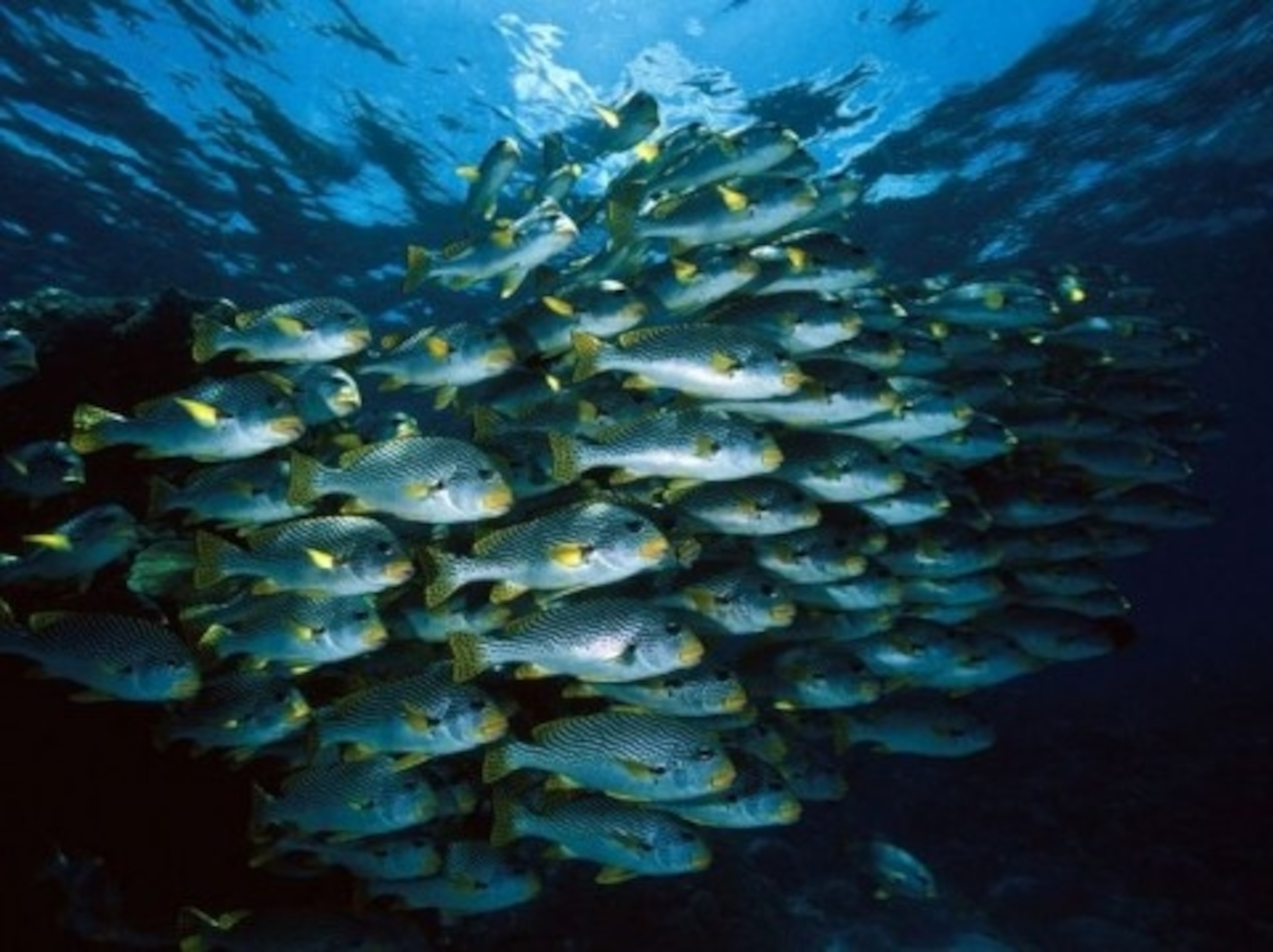 [A school of sweetlips explores the waters of the Great Barrier Reef. By David Doubilet/NGS]