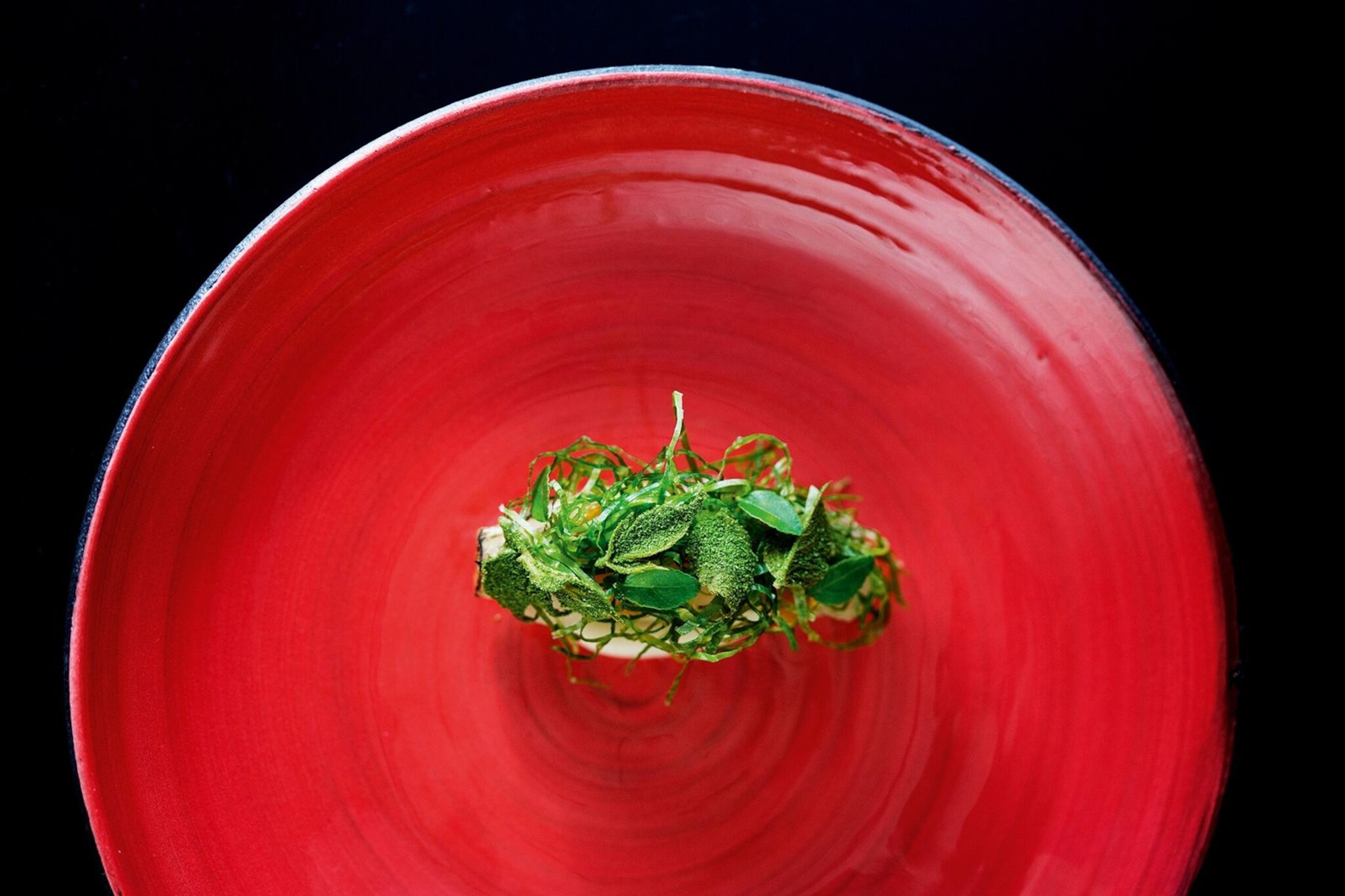 For this starter, two different varieties of sea plant are used to make a delicately flavoured, vibrant blue broth. Seaweed foraged in the waters of the Oosterschelde Estuary, in the southwestern Netherlands, is cured and combined with fresh algae cultivated in Rotterdam. In the broth sit fine slices of pickled vegetables and a drizzle of sea-lettuce oil.