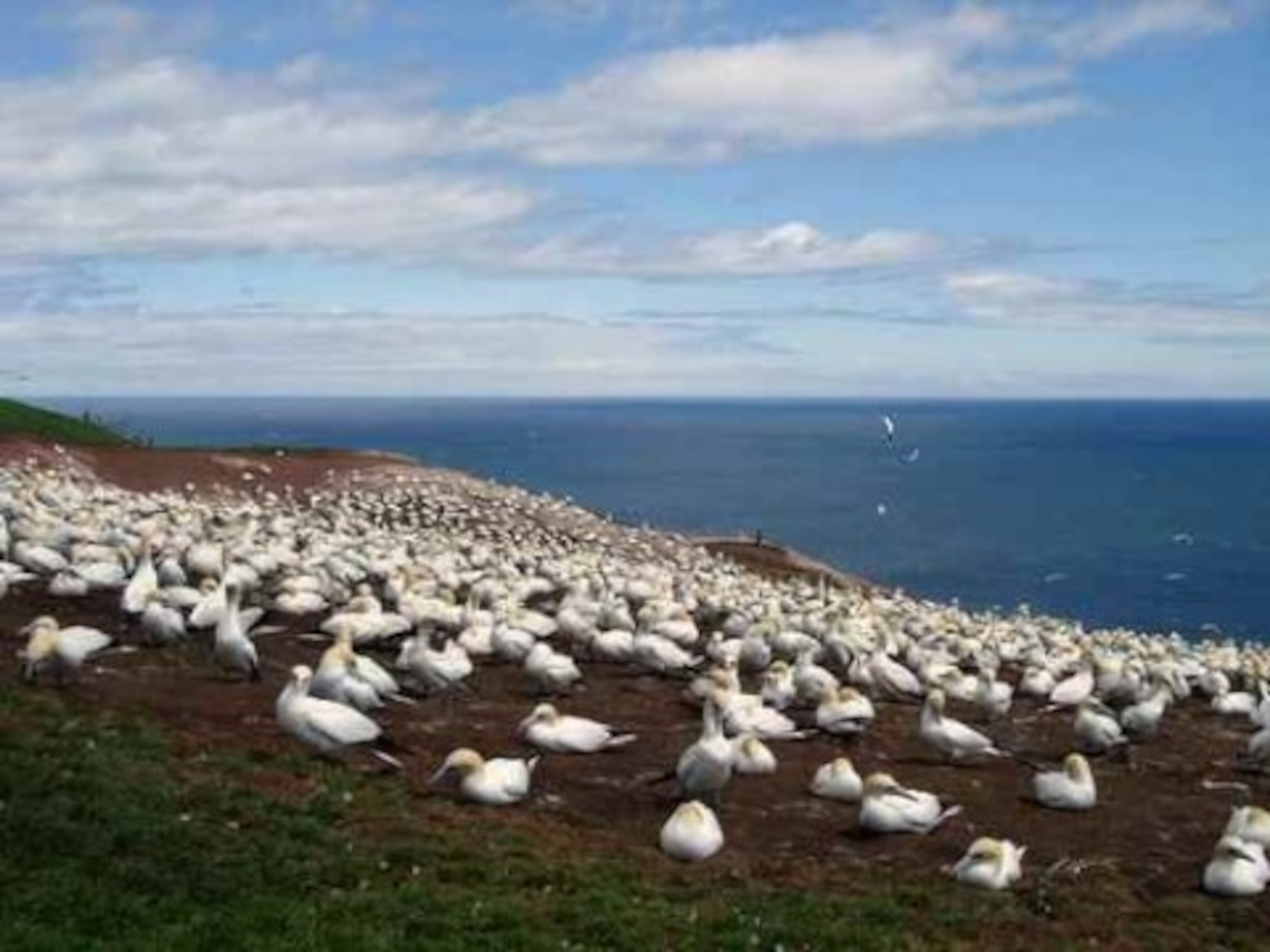 — the village of Percé lies two miles away by boat. The boreal forest we were hiking through opened and there before us at the end of the island was one of the largest gannet colonies in the world. These large white birds — the size of geese and with sleek yellowish heads and black wingtips — were sitting on nests and landing and taking off and fussing about with each other. They covered all of the real estate between the forest edge and the cliff.