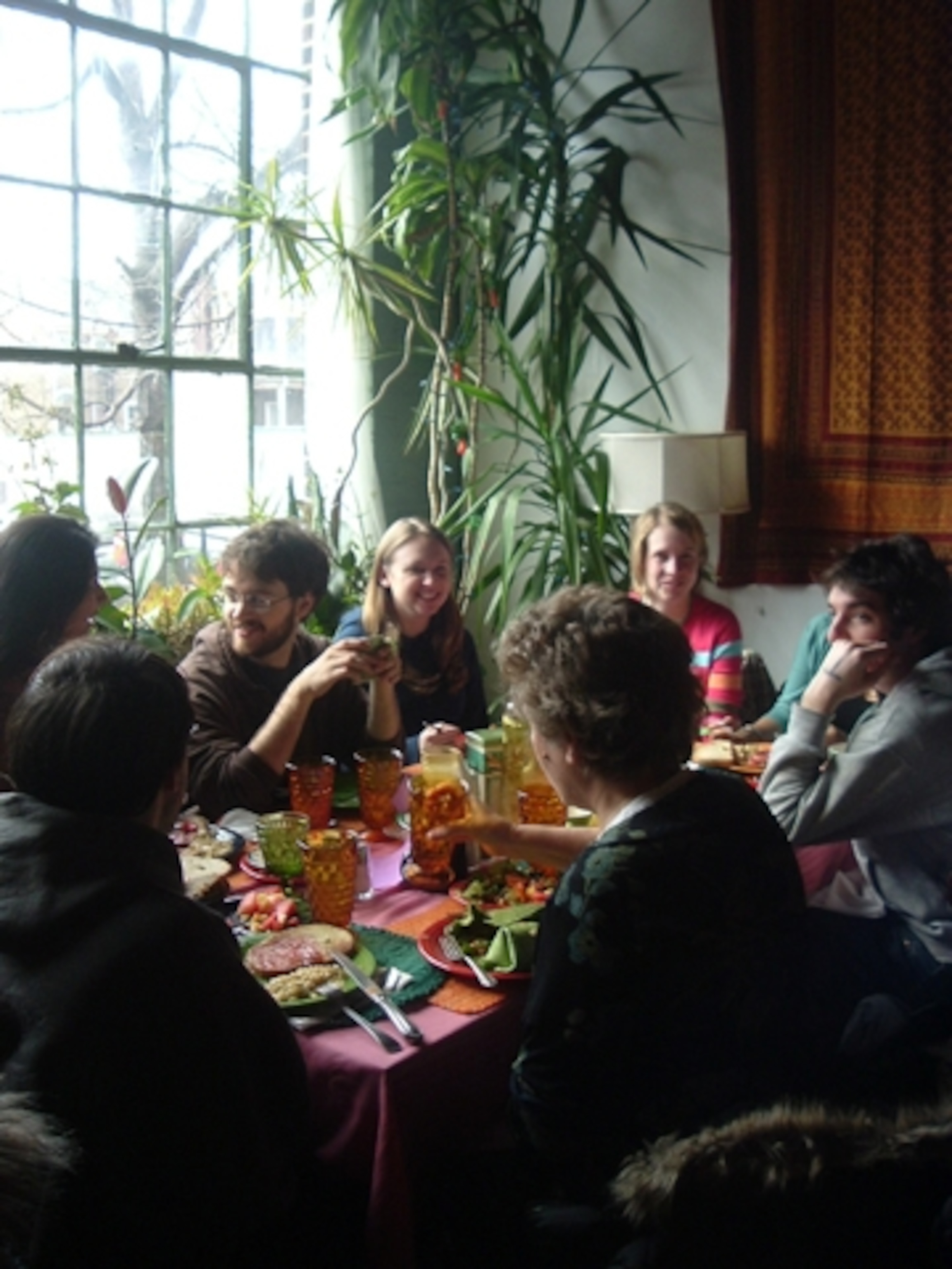 Every Sunday between 11 a.m. and 2:30 p.m. Zenith serves an extremely popular vegetarian brunch for $10, which includes an entrée, a huge array of homemade salads, delectable all-you-can-eat desserts, plus coffee or your choice of 75 different kinds of tea served in wacky teapots. The teapots, as well as the glassware, plates, silverware, tablecloths, lamps, artwork on the walls, and even your chair are all for sale. Zenith specializes in 20th century collectibles and vintage clothing, and they have chairs and baby carriages hanging from the ceiling as well. We lucked out with the big table near the window that we snagged without a wait (very unusual), despite having a large group. The food was so good I didn’t realize until later that it was vegan, and I’m happy to report the dish did not run away with the spoon, at least not while we were eating.