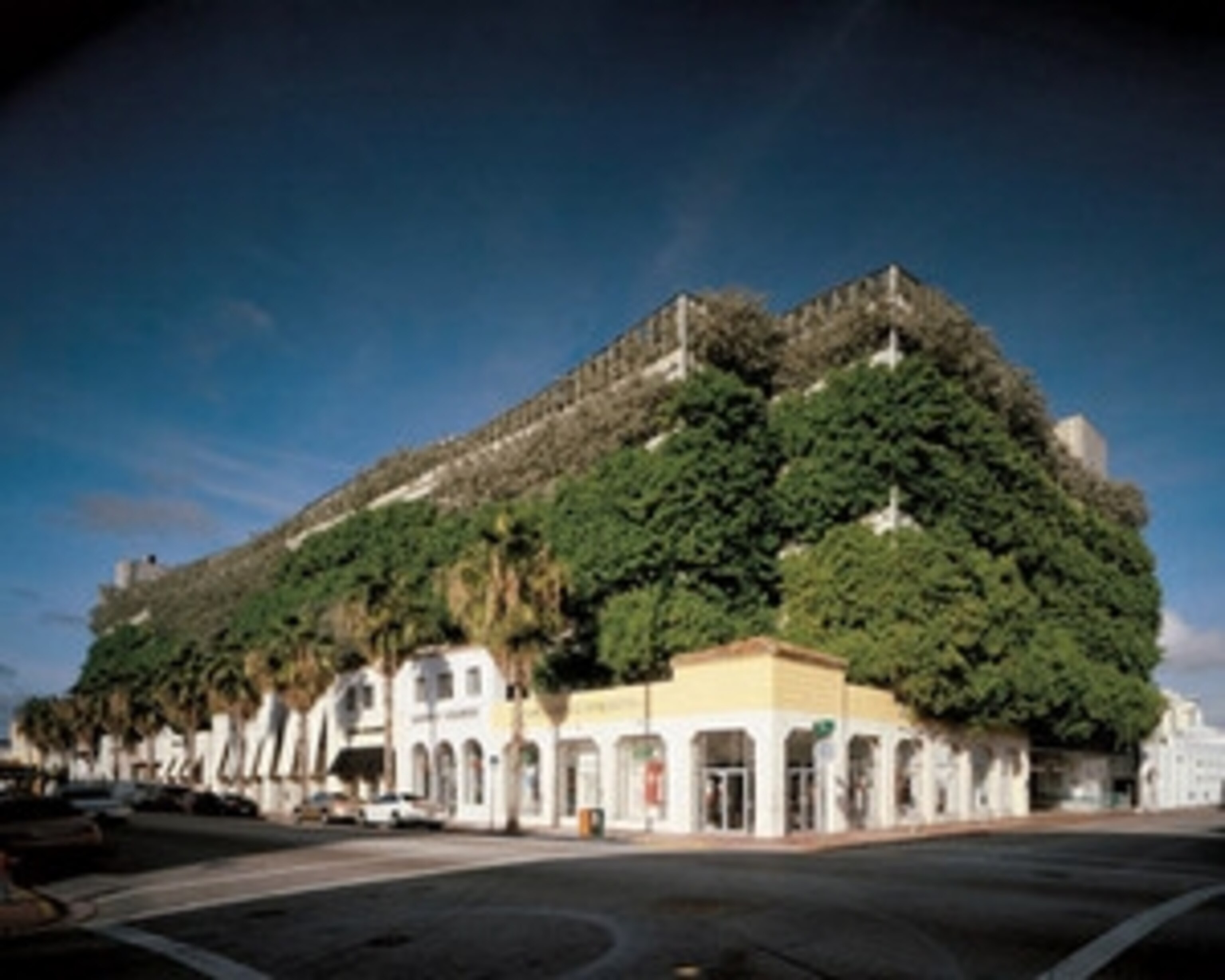 The building includes street-level shops, a restored Art Deco façade and six parking levels concealed behind a trellised, carbon-dioxide-absorbing planting of Clusia guttifera [a flowering shrub with leathery leaves], Conocarpus erectus, var. sericeus [silver buttonwood] and Scaevola frutescans [a tropical beach shrub]. Palm trees planted along the sidewalk provide shade.